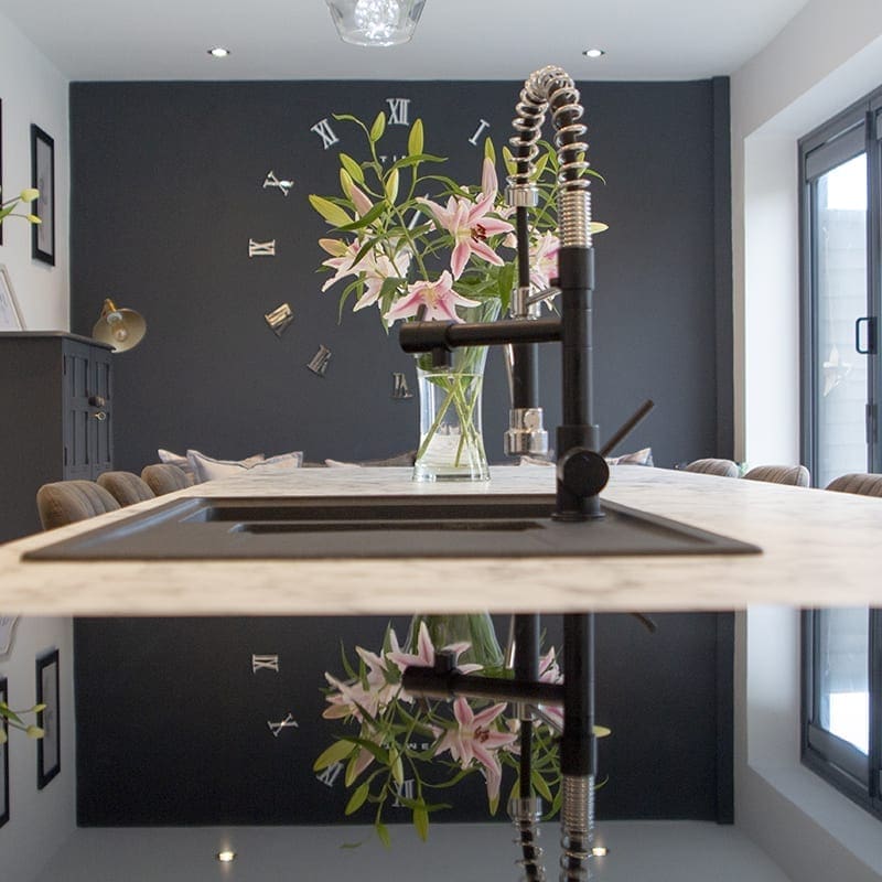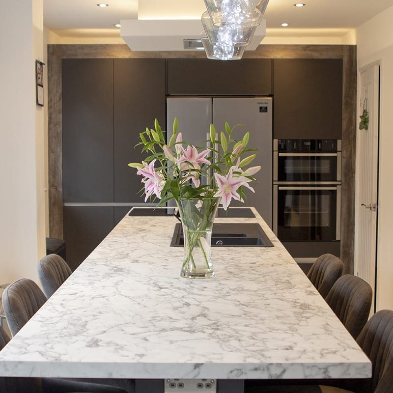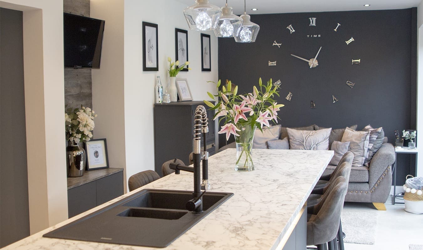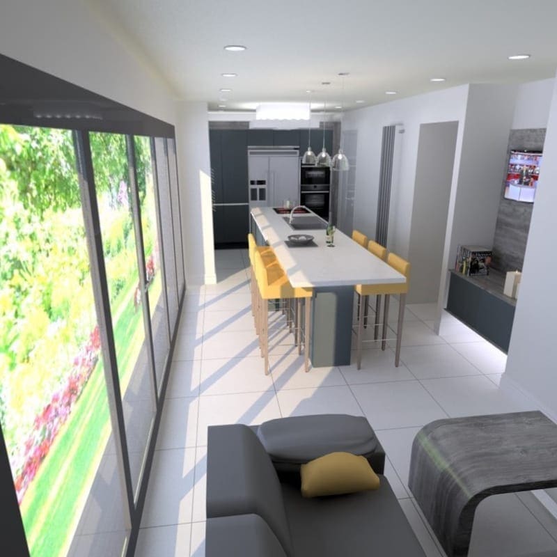This family of four wanted an open plan kitchen incorporating a long island and dining space for 6, with a family TV and seating area as well. Large bi-fold doors would ensure external and internal areas were merged. The look they wanted was modern, with a muted colour scheme of greys and white, ensuring a minimalistic feel was achieved.
