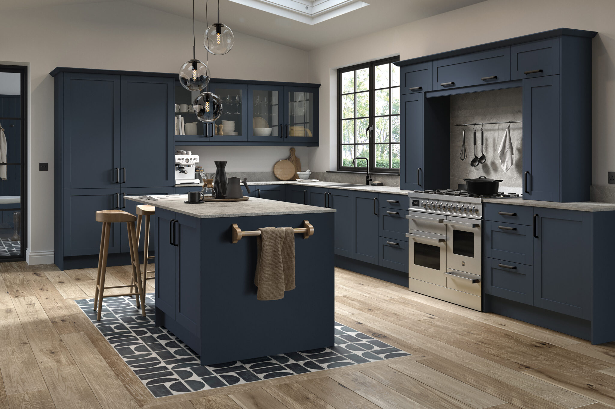 Whether you prefer a classic or contemporary style, the Dylan shaker door is a blank canvas for you to add your own personal taste. Shown here in Indigo against a concrete effect quartz worktop, white walls and black metal handles, giving an industrial feel. Yet the White Grey and Indigo and the White Grey and Dust Grey combinations offer a lighter and brighter country kitchen aesthetic.