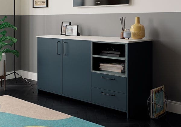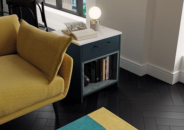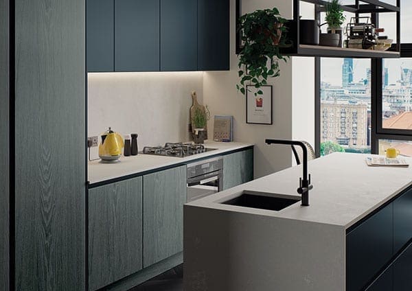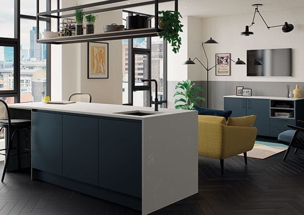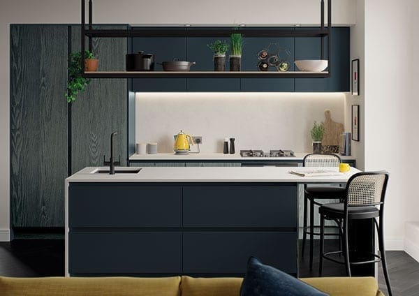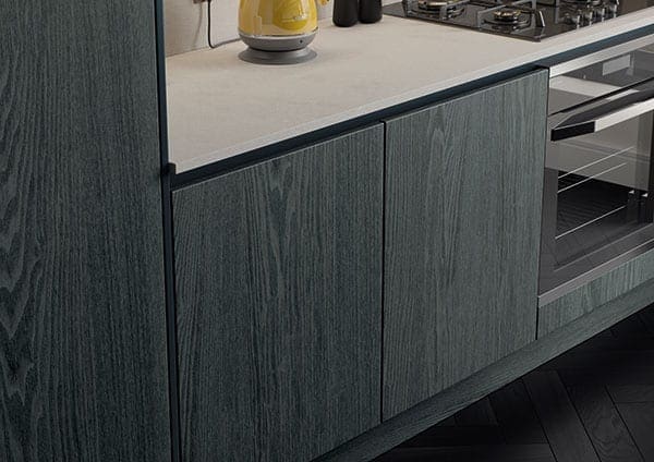 The dramatic ash grain of Kelso stained in Pacific Blue, paired here with the contrast of the smooth Zola Matte in Marine brings a contemporary twist to this kitchen. The Kelso is available in six different coloured stains.