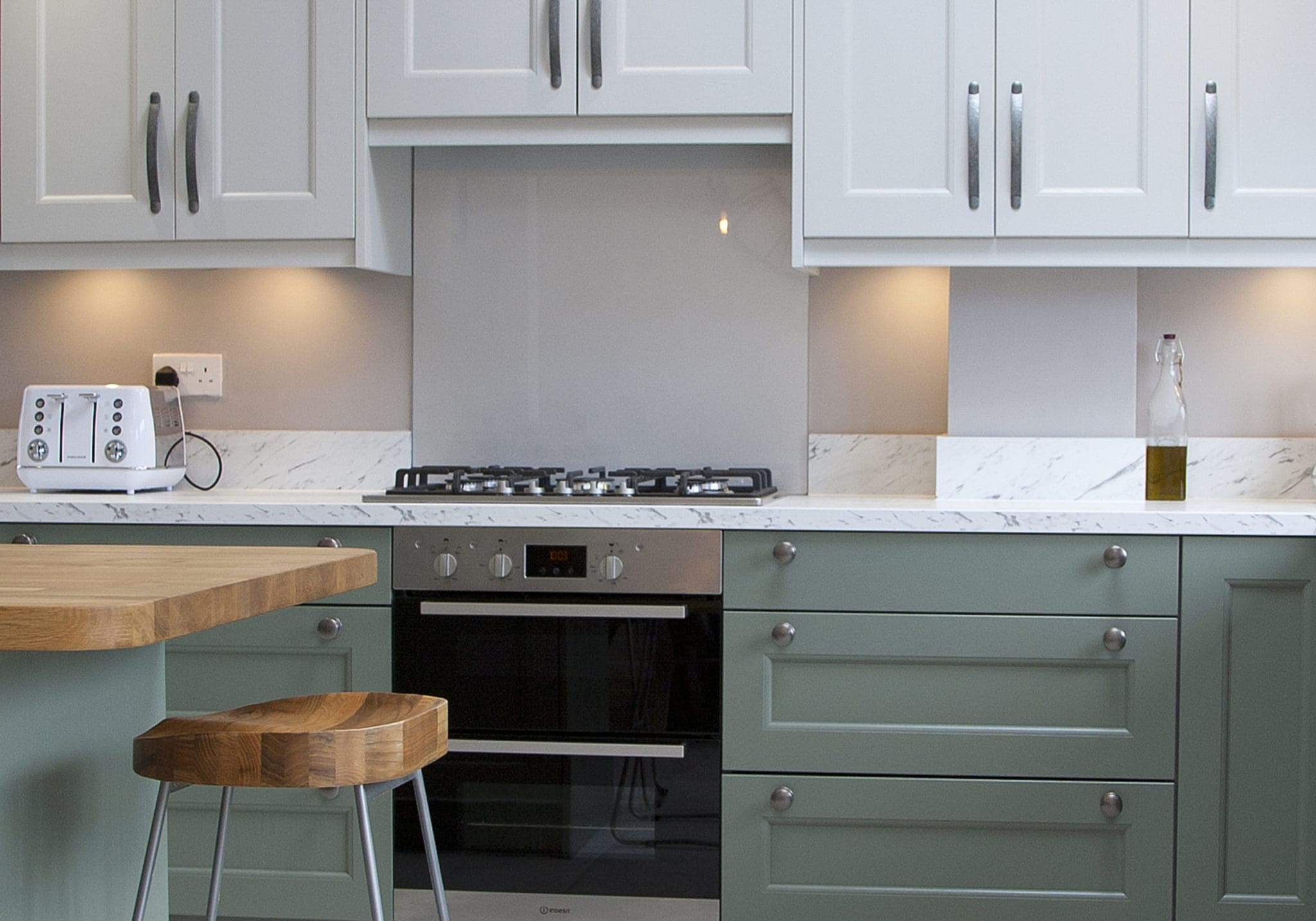 A Carrerra Marble laminate worktop beautifully complemented this gorgeous colour scheme. The light colour of the work surface, together with the marble fleck, added a statement to the overall look.