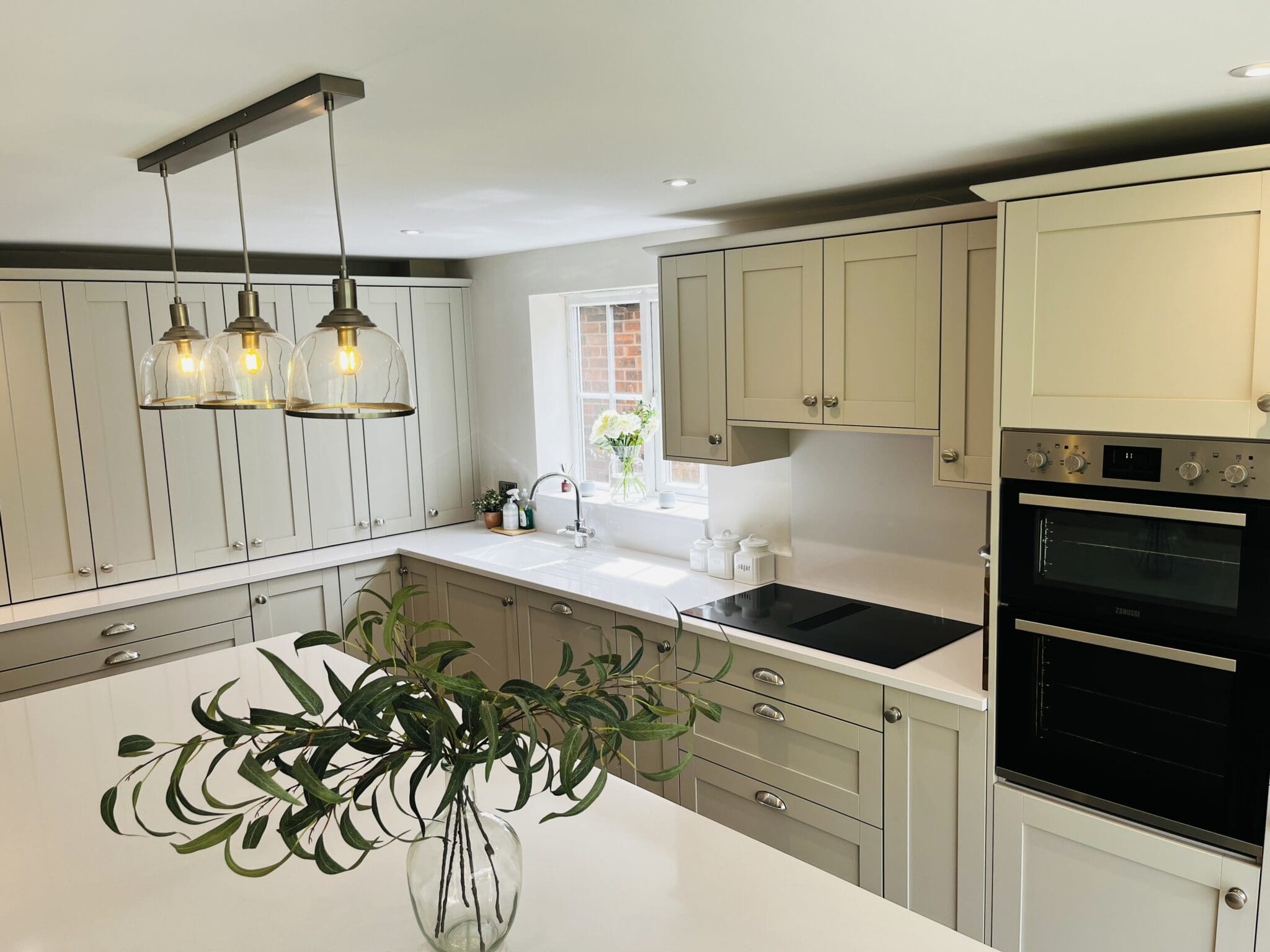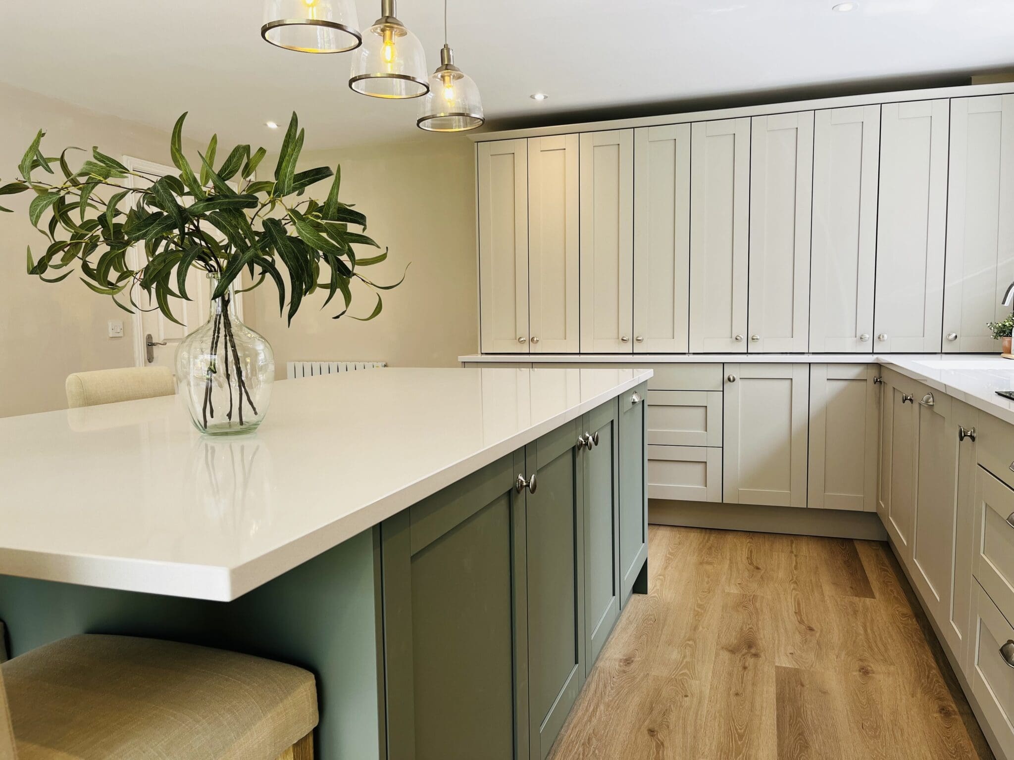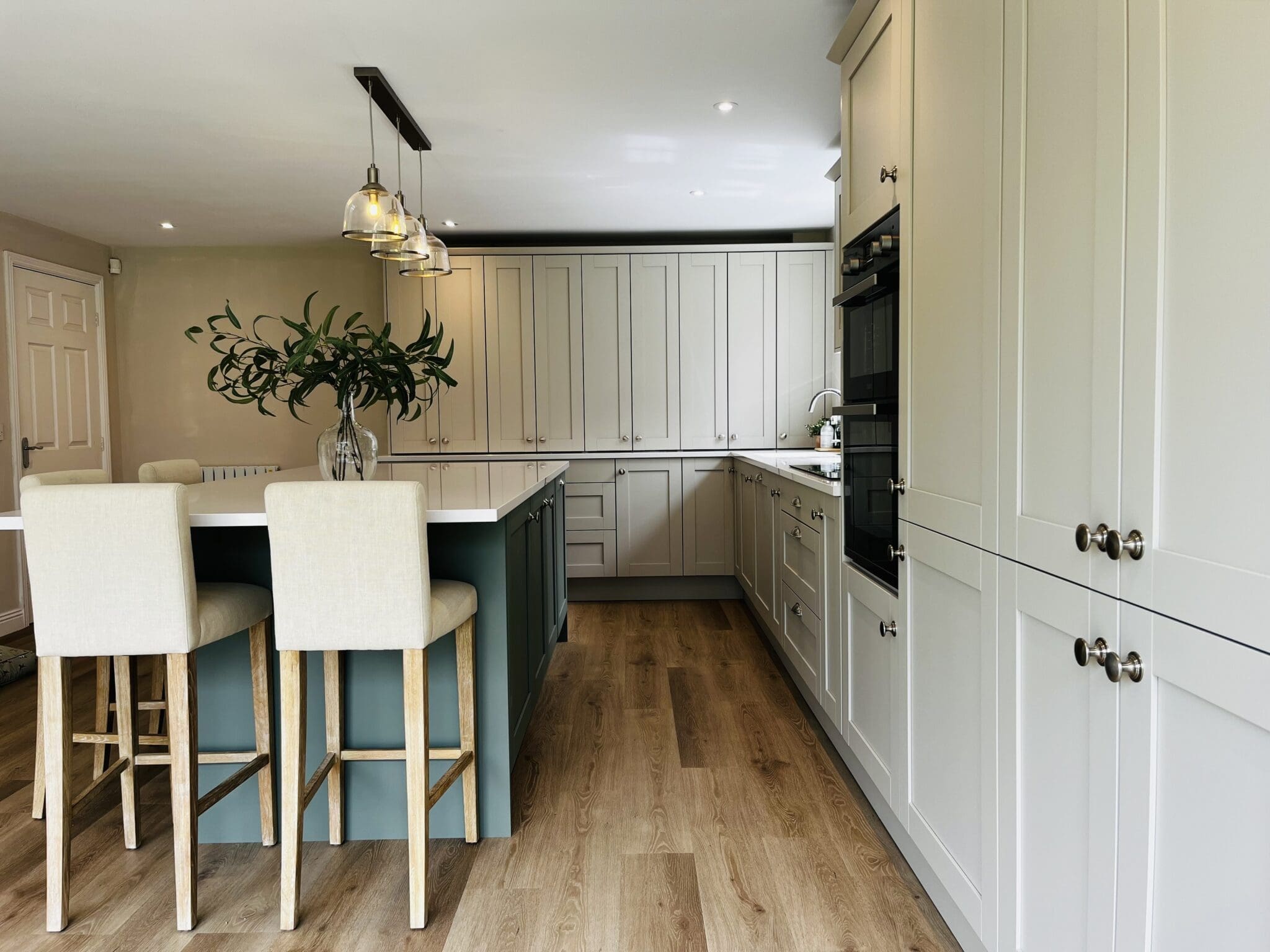 Dylan in matt Taupe, a contemporary 5 piece shaker door by Ethos, was chosen for the wall units with a contrasting colour of Reed Green for the island units. Knobs and cup handles in Brushed Nickel are by Stori. The