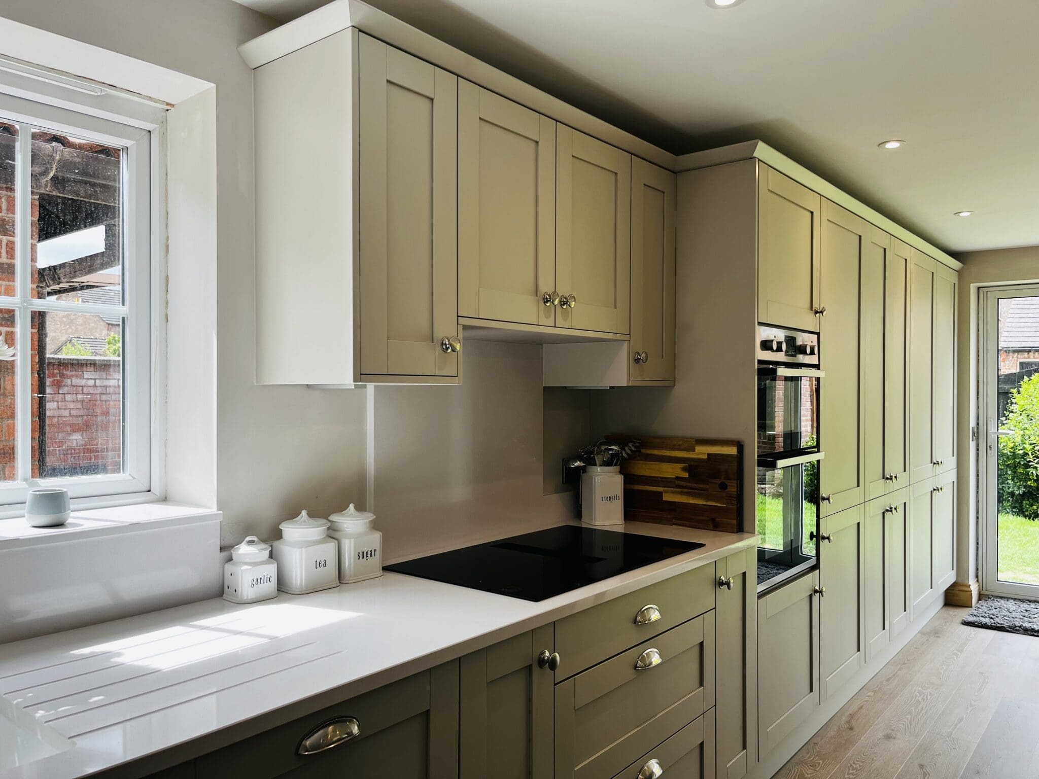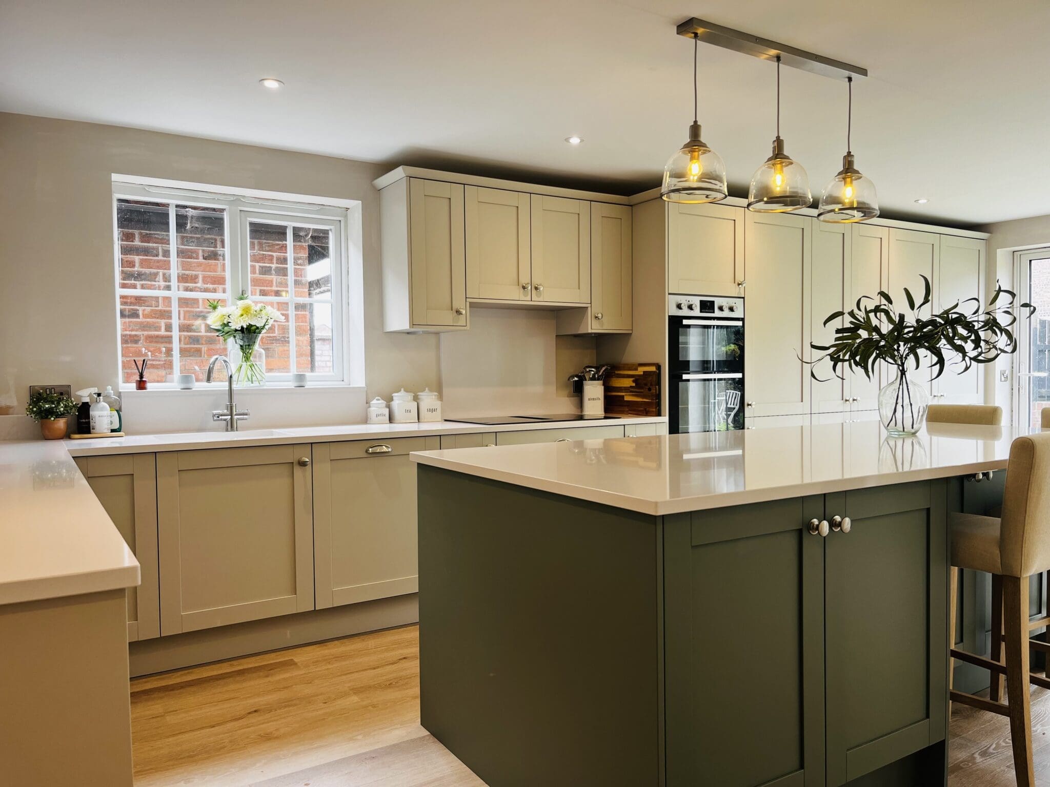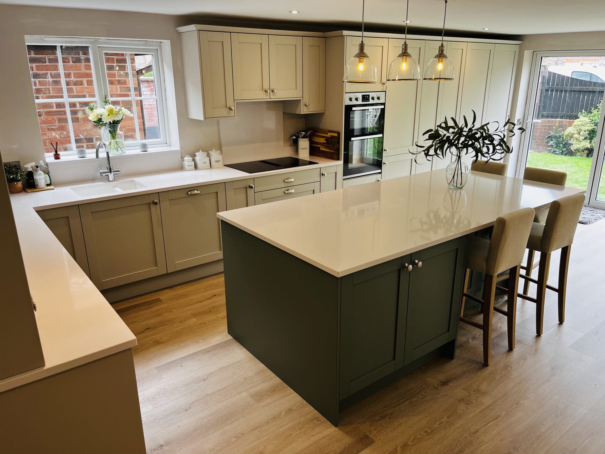 Dylan in matt Taupe, a contemporary 5 piece shaker door by Ethos, was chosen for the wall units with a contrasting colour of Reed Green for the island units. Knobs and cup handles in Brushed Nickel are by Stori. The