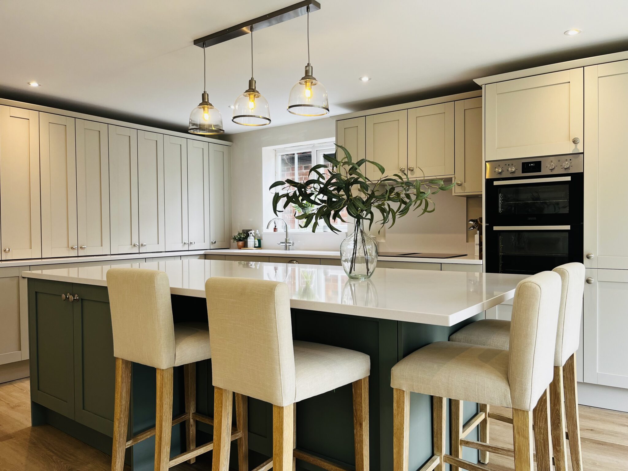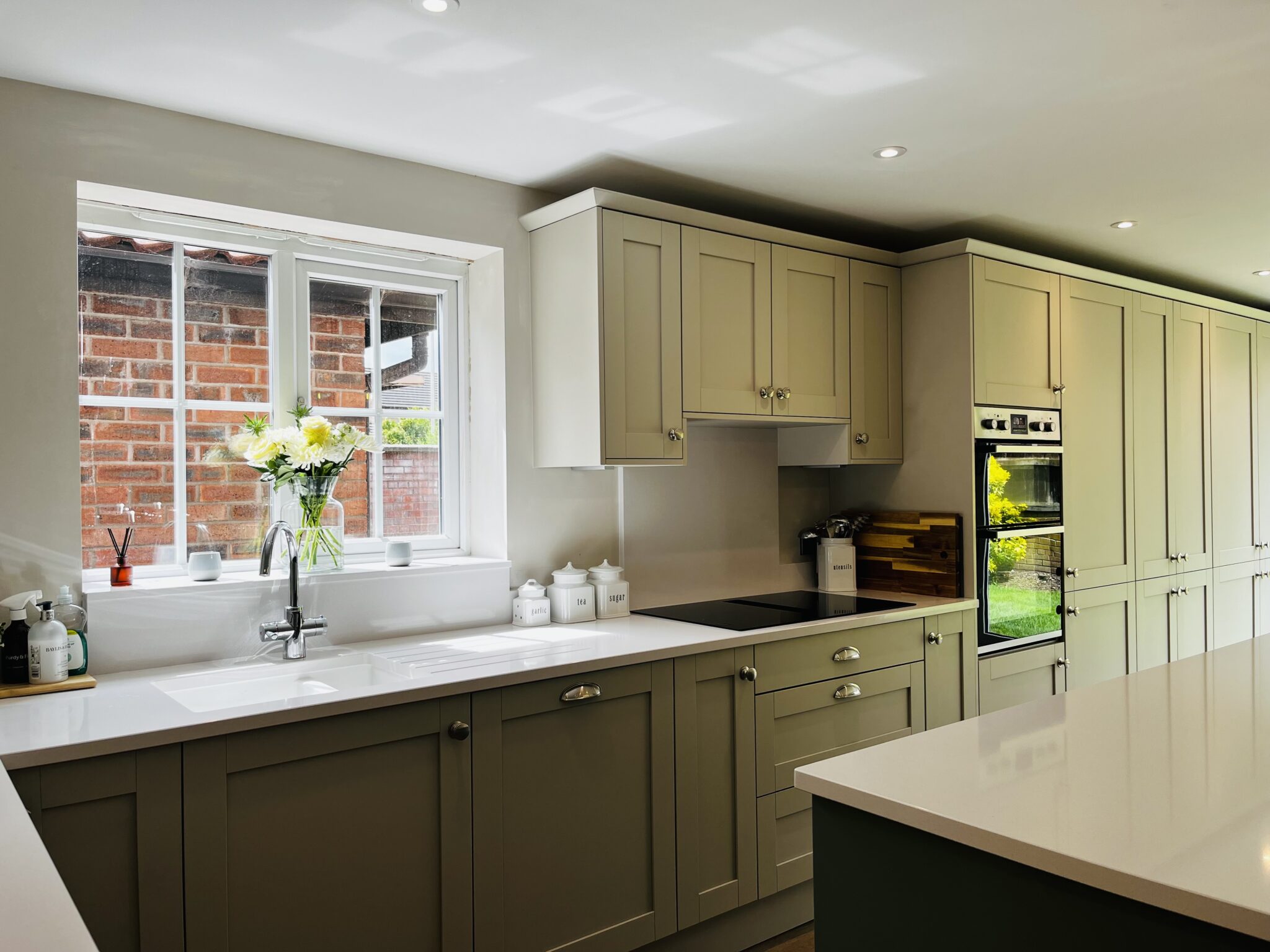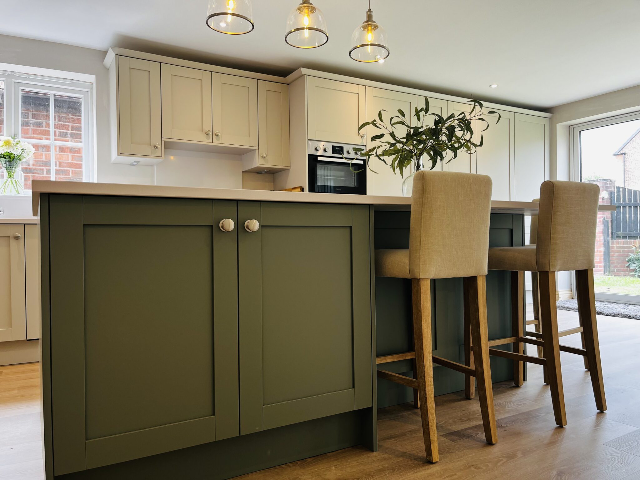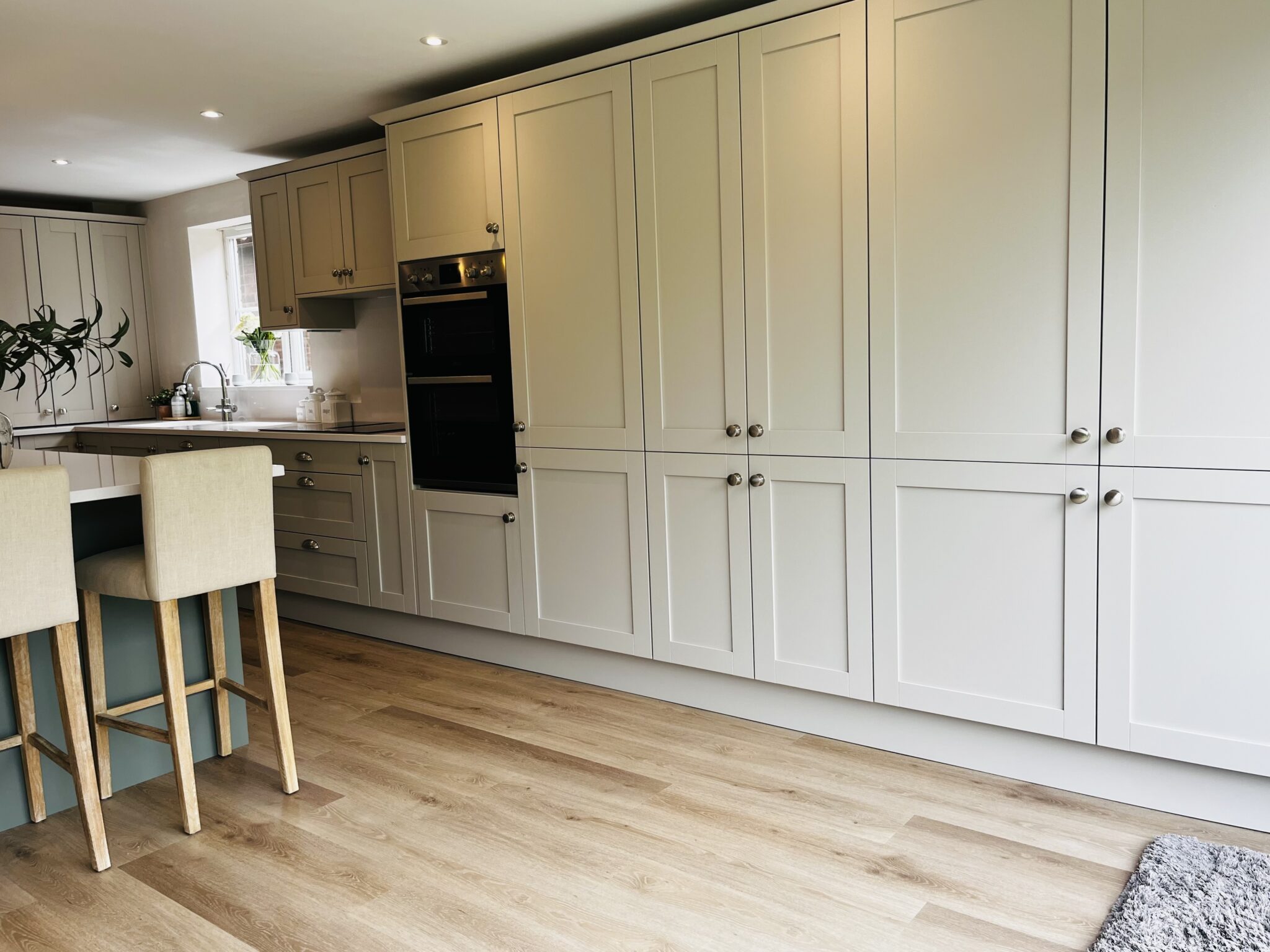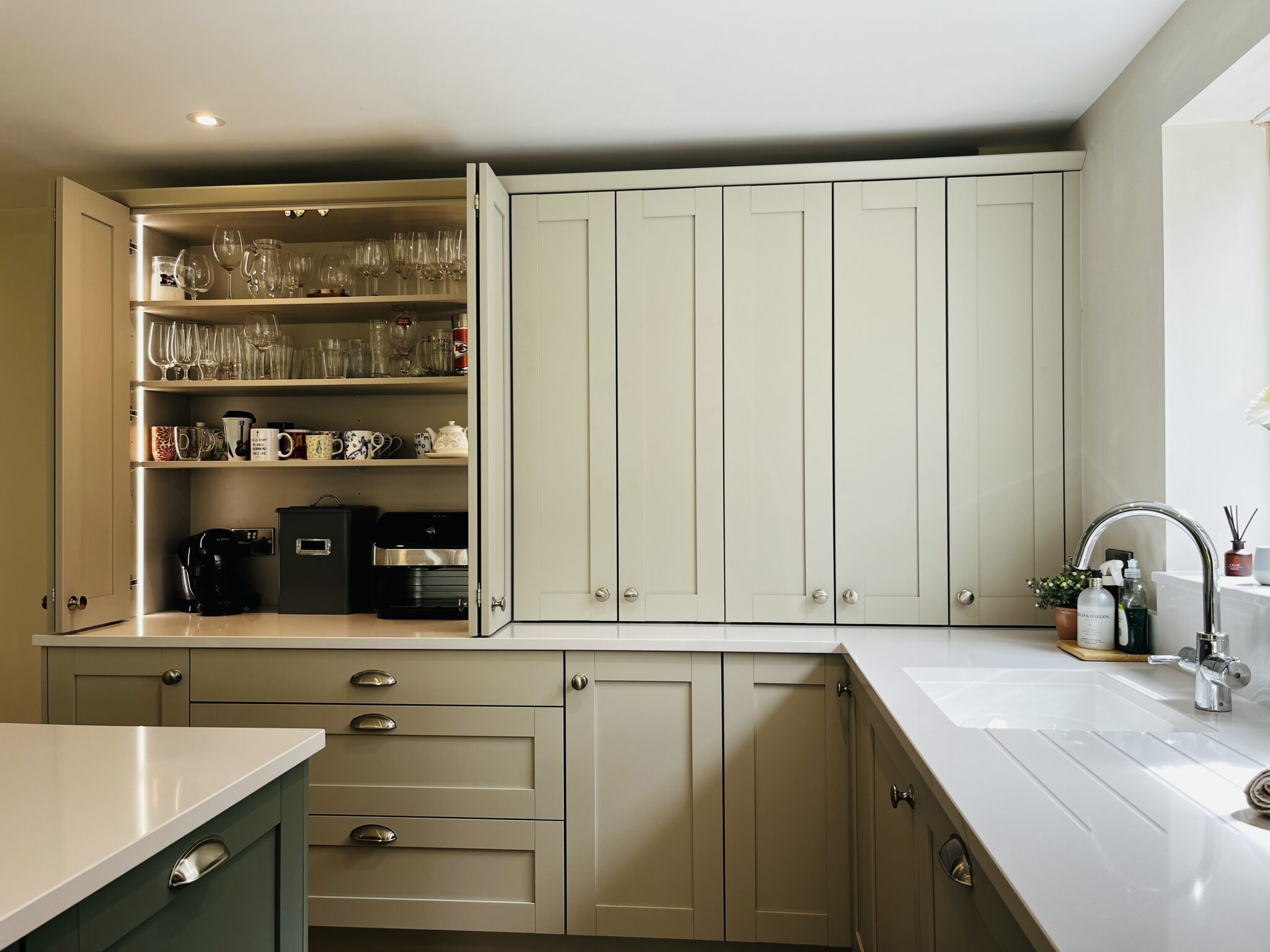 Dylan in matt Taupe, a contemporary 5 piece shaker door by Ethos, was chosen for the wall units with a contrasting colour of Reed Green for the island units. Knobs and cup handles in Brushed Nickel are by Stori. The