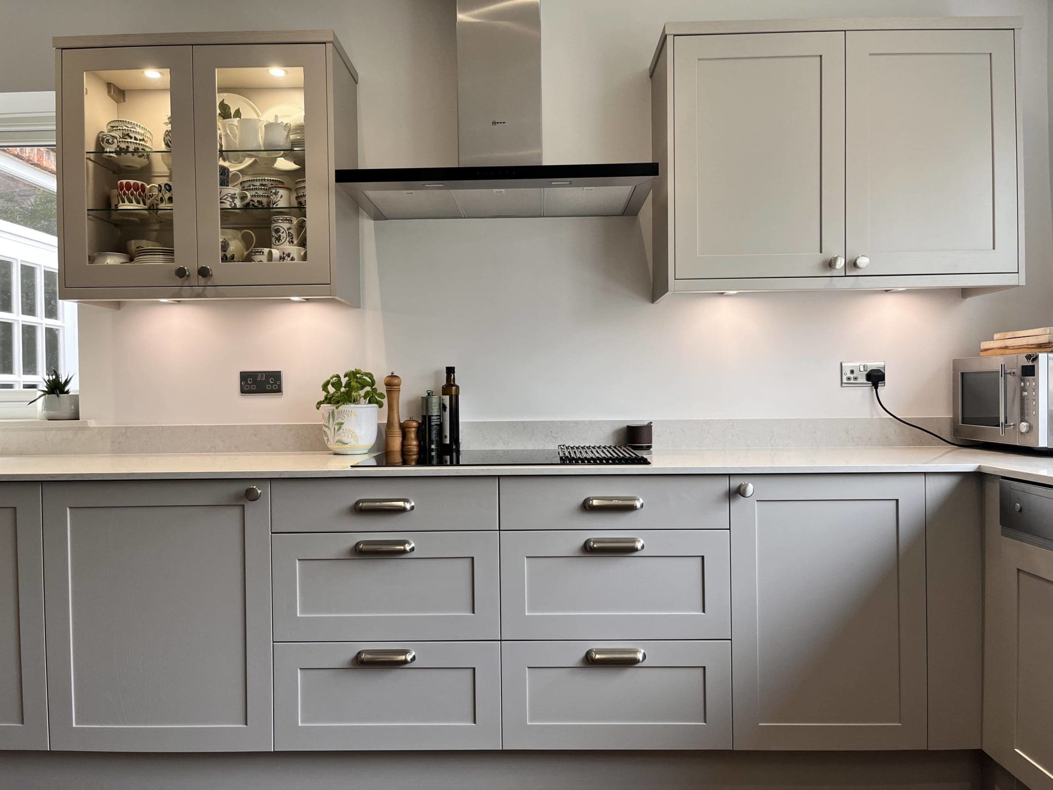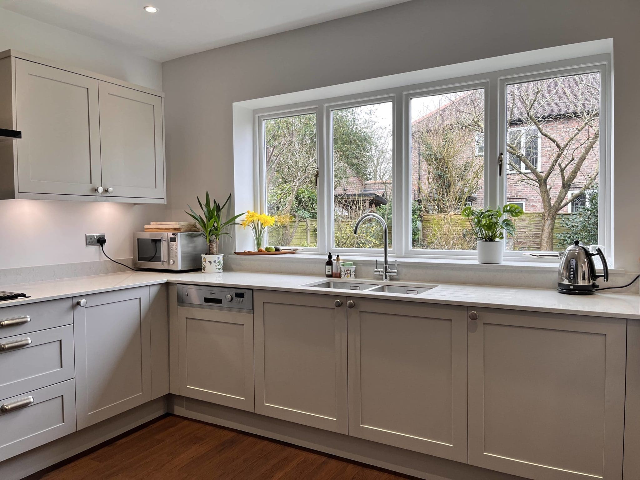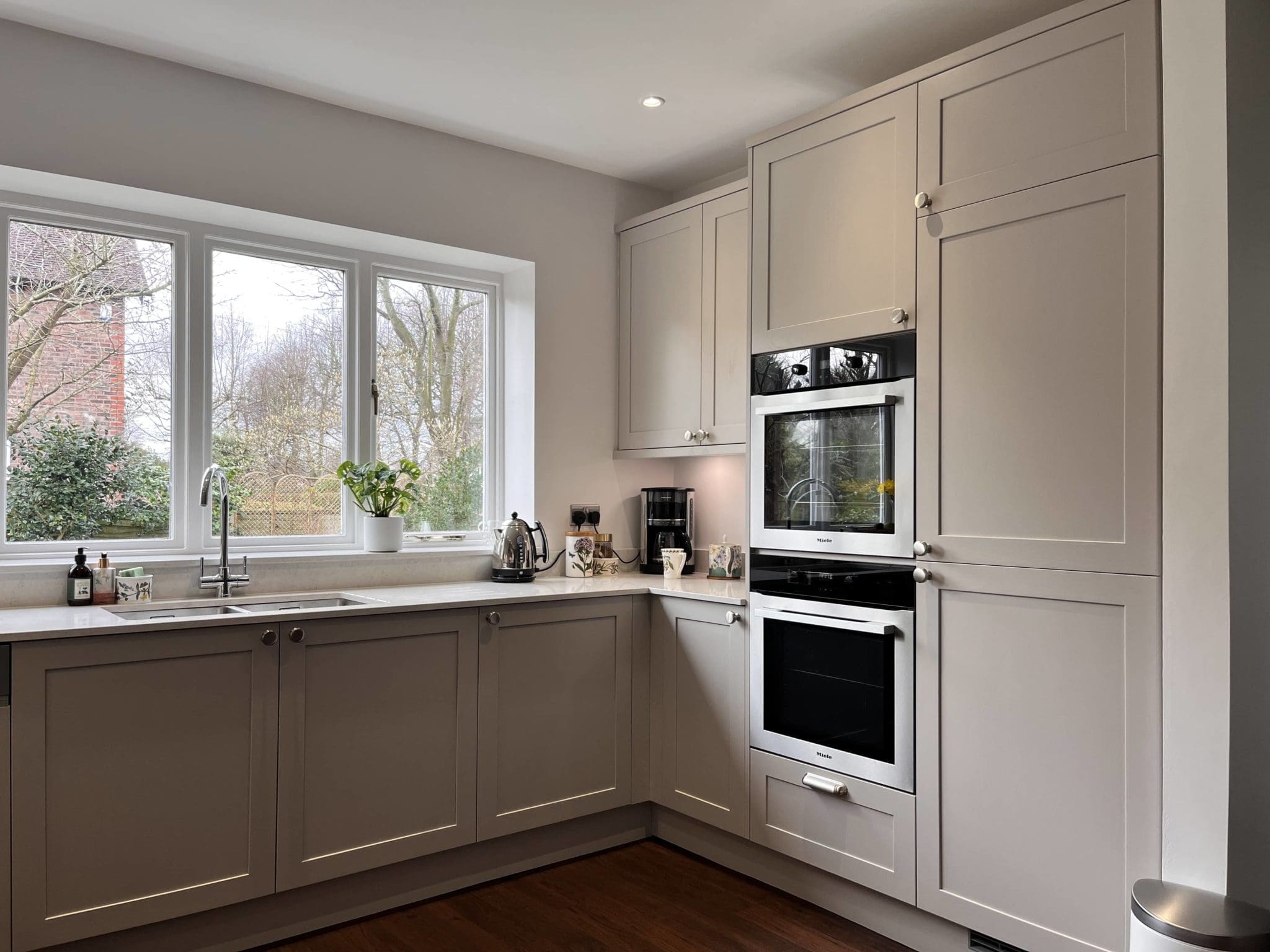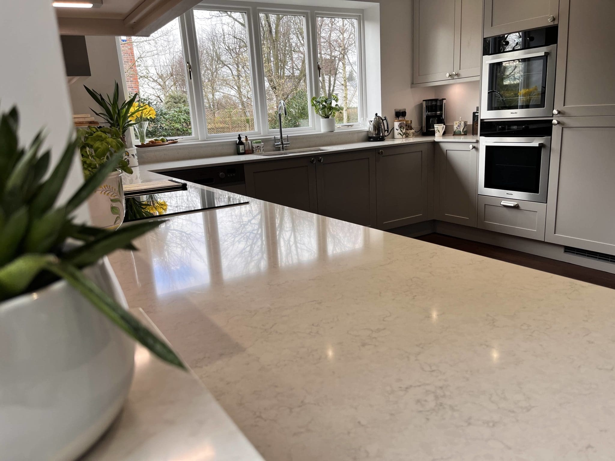 Work surfaces, upstands and window sills are in Snowy Ibiza Silestone by Cosentino.  They flawlessly complement the warm, natural tones of the Cashmere units.