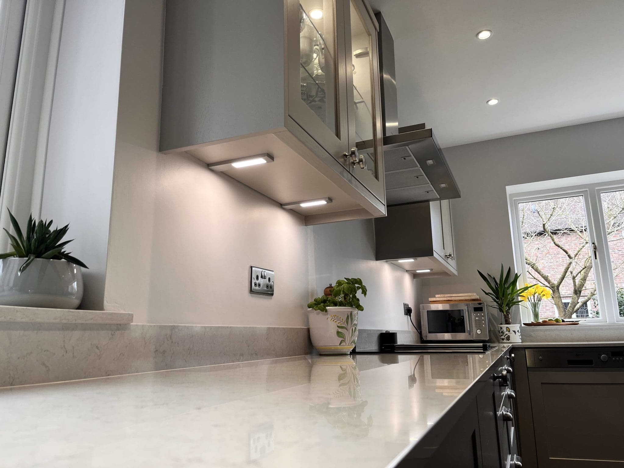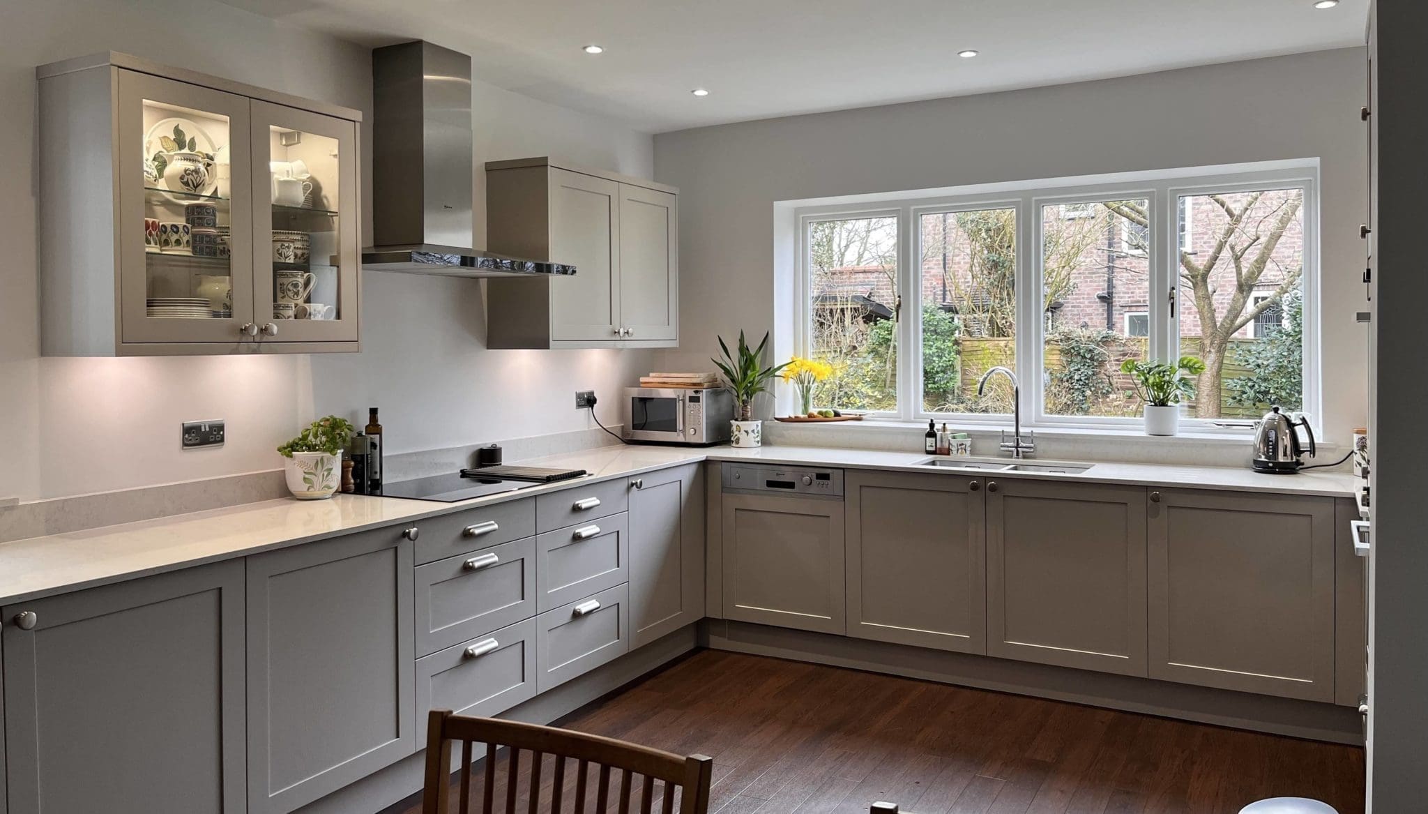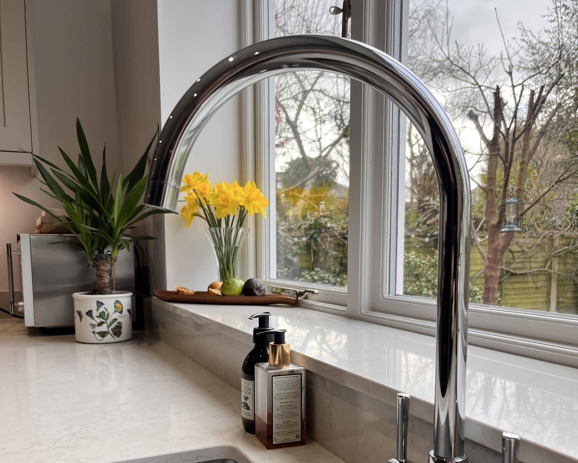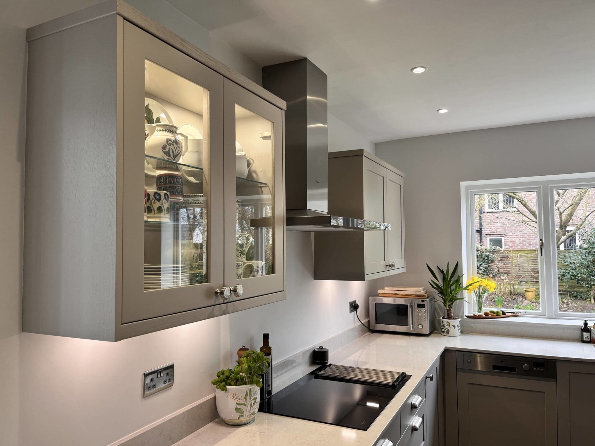 Work surfaces, upstands and window sills are in Snowy Ibiza Silestone by Cosentino.  They flawlessly complement the warm, natural tones of the Cashmere units.
