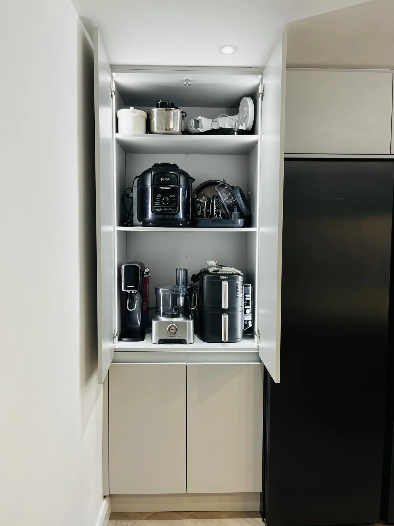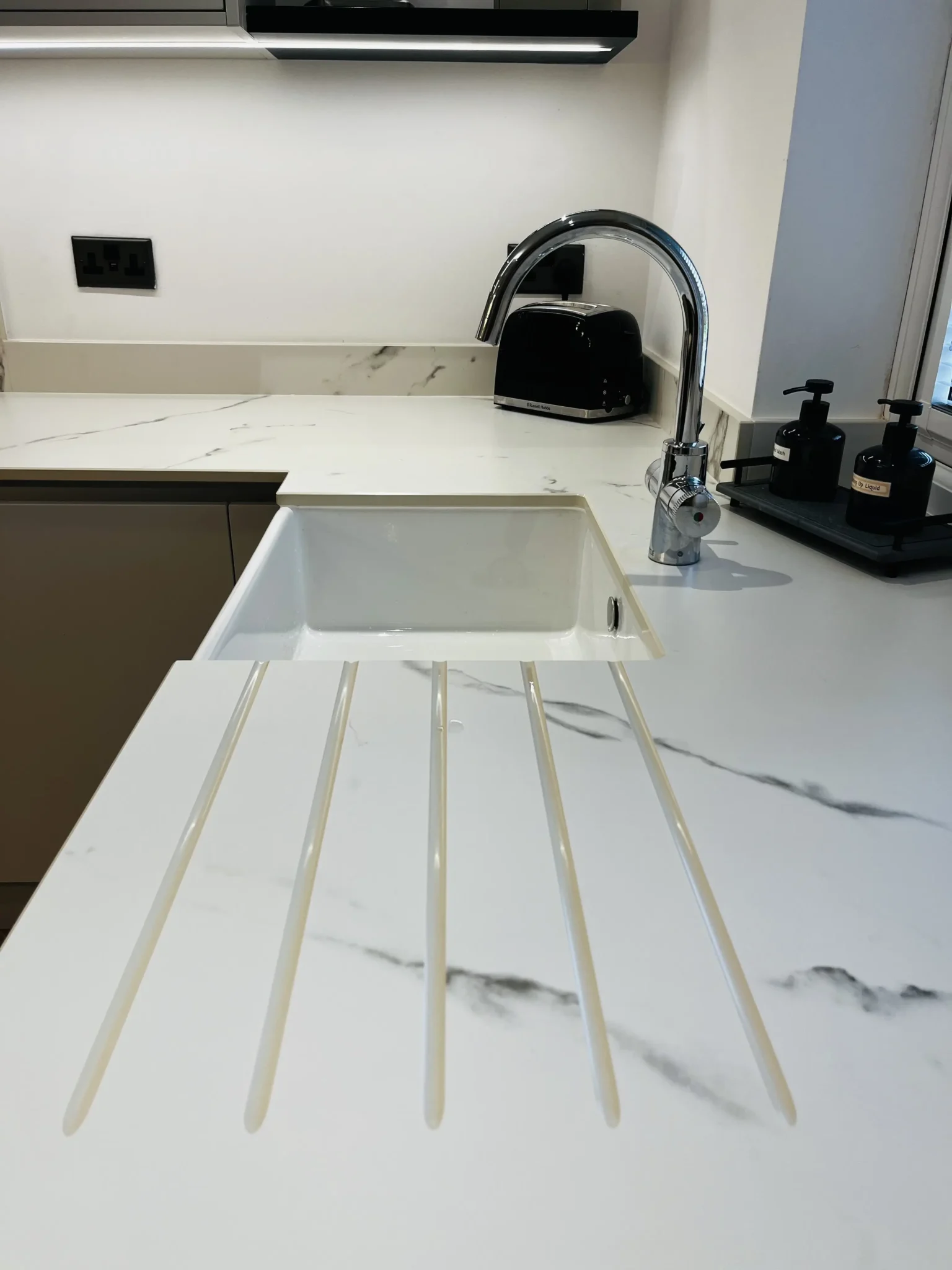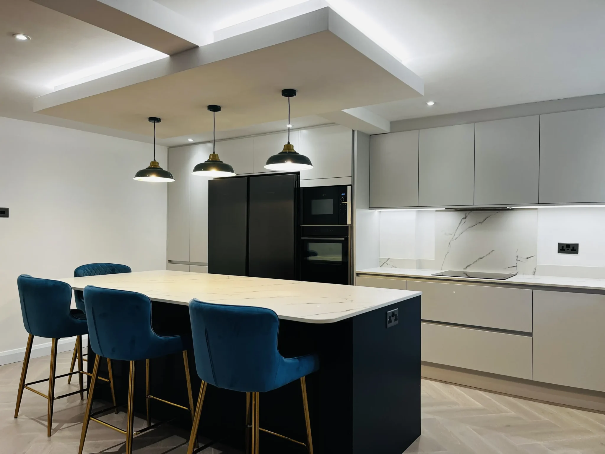 Work surfaces, splashback, and island are 20mm Dekton Kairos by Cosentino, which was a perfect choice for this family. The customer wanted 4 stools around the breakfast bar so the island was made bespoke with sweeping curves on 3 sides. It’s now the perfect place to host from whilst entertaining guests. A bespoke built bulkhead provides a unique feature, allowing for subtle down lighting as well as the customer’s choice of pendants.