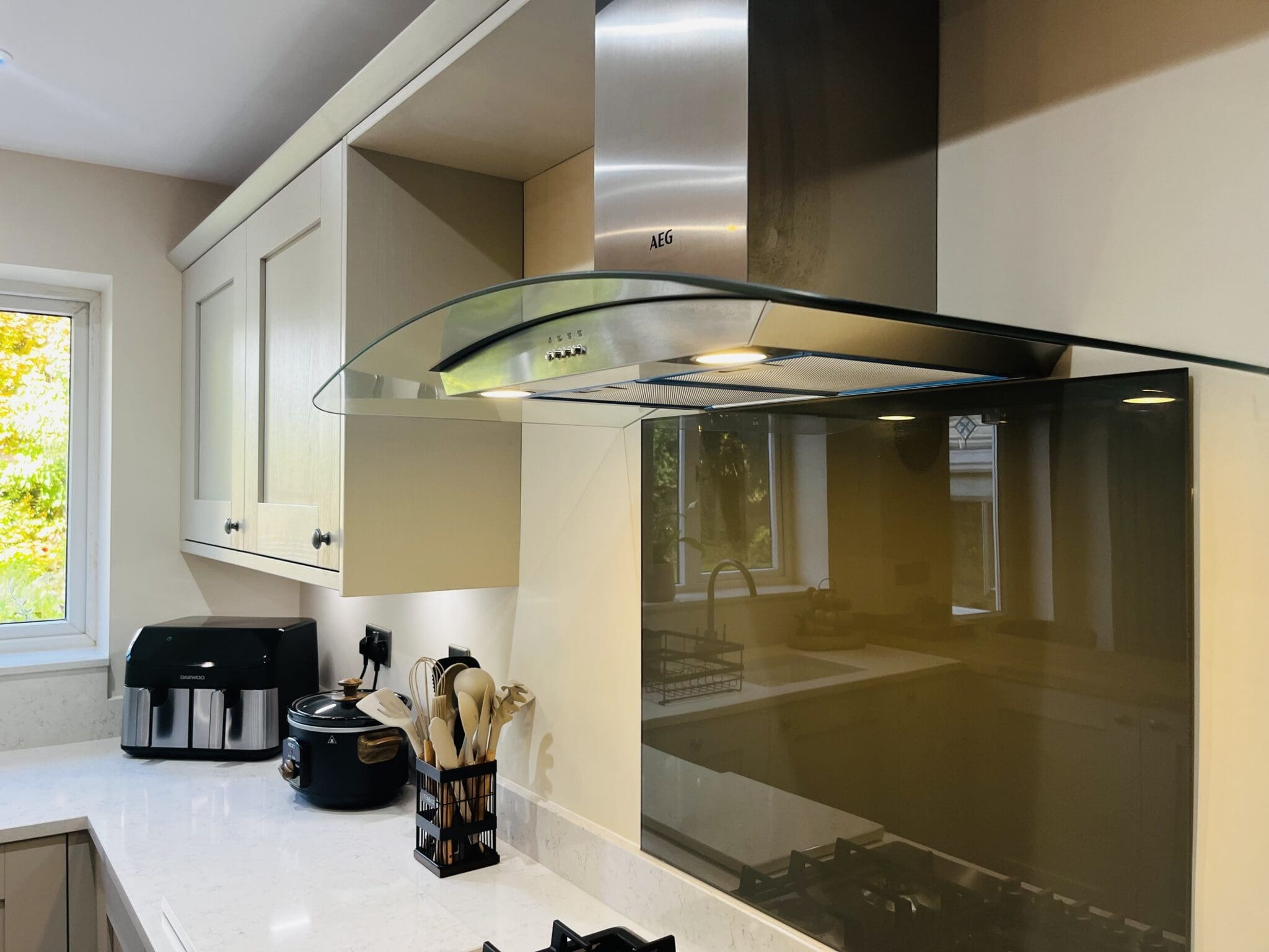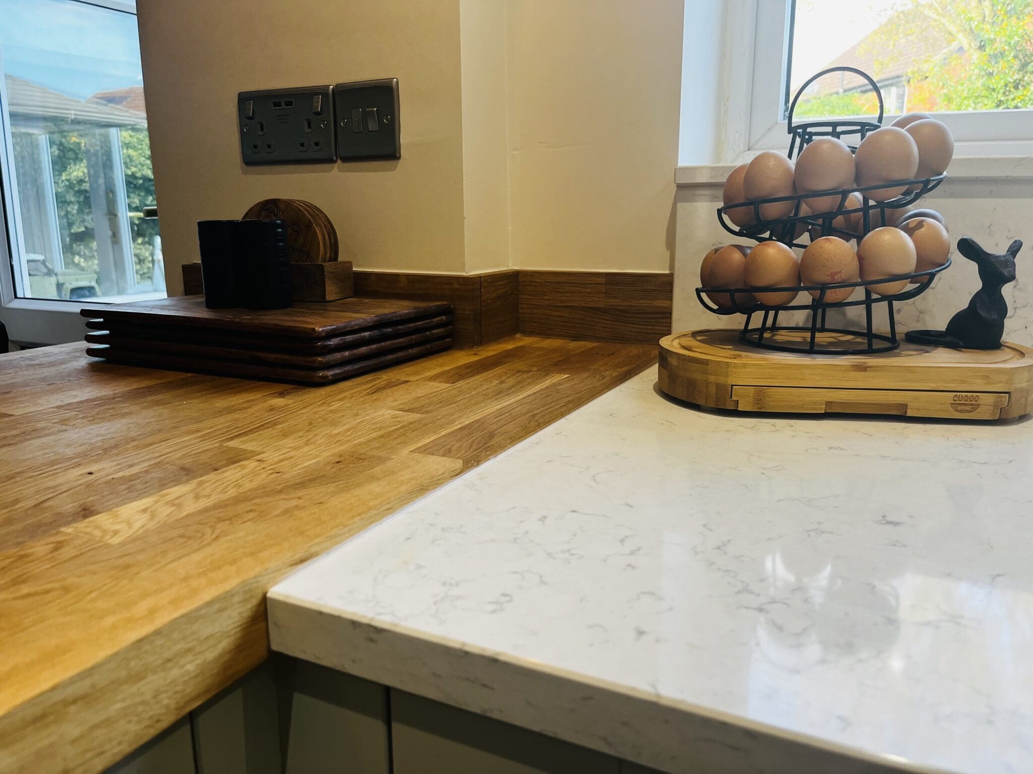 The design includes a peninsular in 40mm Oak with co-ordinating upstand, which not only gives extra storage, but also ticks a box on the customer’s wish list to have a breakfast bar. Comfortable bar stools mean breakfast, lunch or dinner can now be a social affair. The work surfaces, windowsill and upstands are in Silestone Blanco Orion by Cosentino with a glass