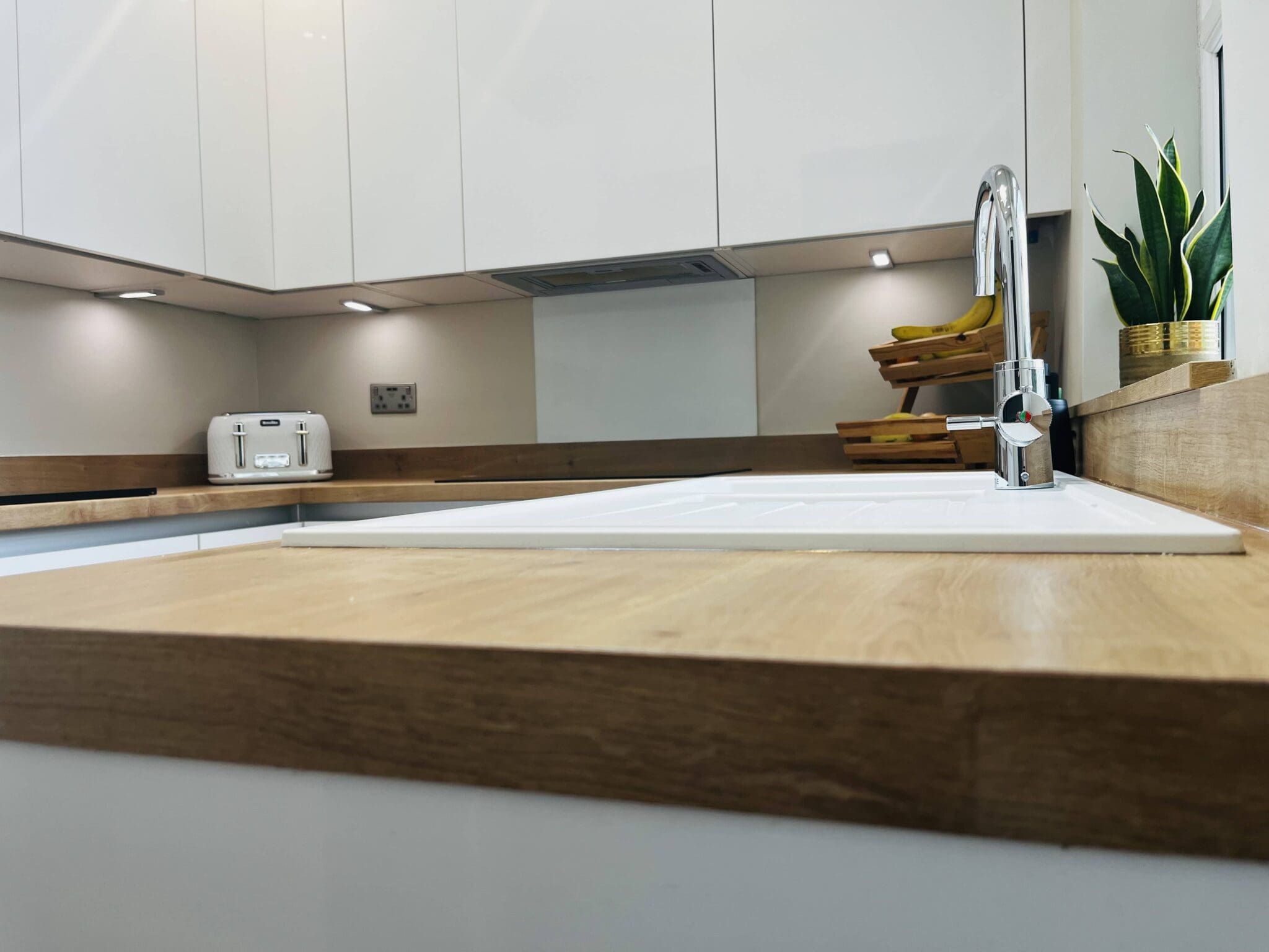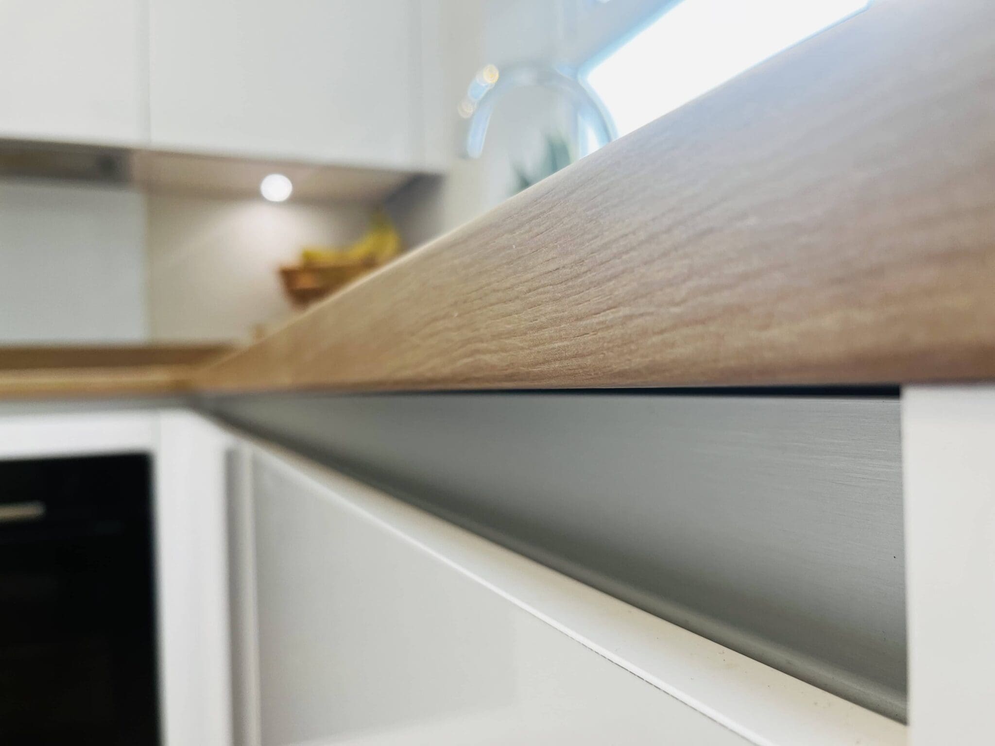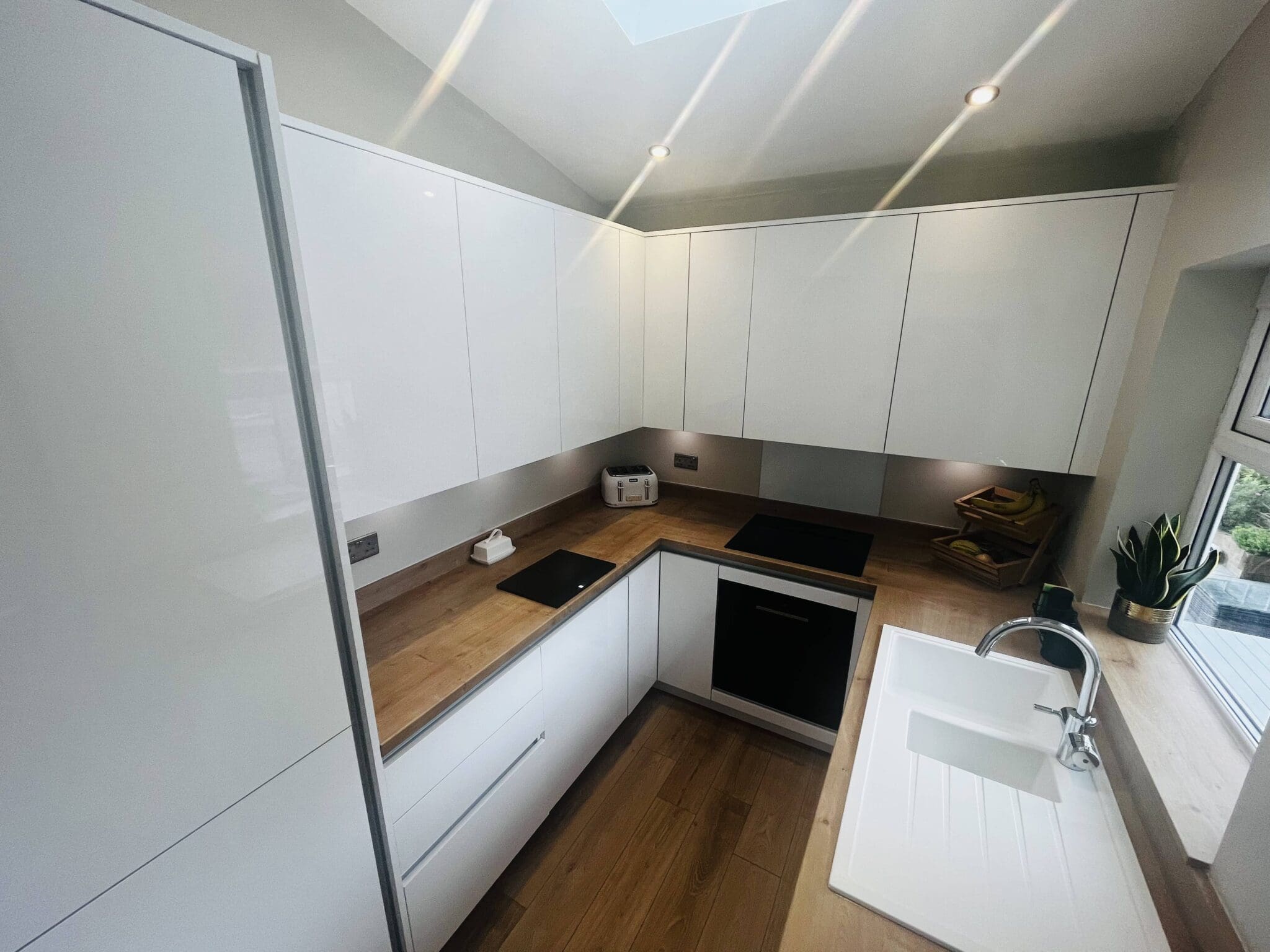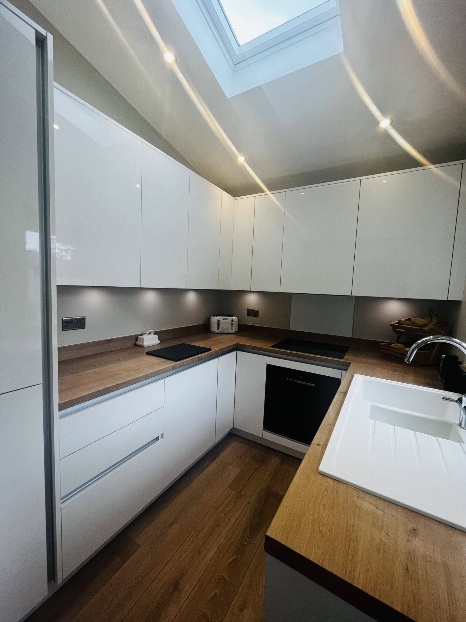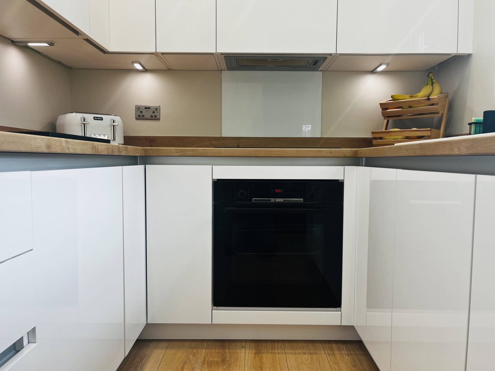 White gloss handleless doors with a brushed steel gola rail perfected the minimalist trend. Sleek, clean and on trend this small kitchen has the ‘wow’ factor.