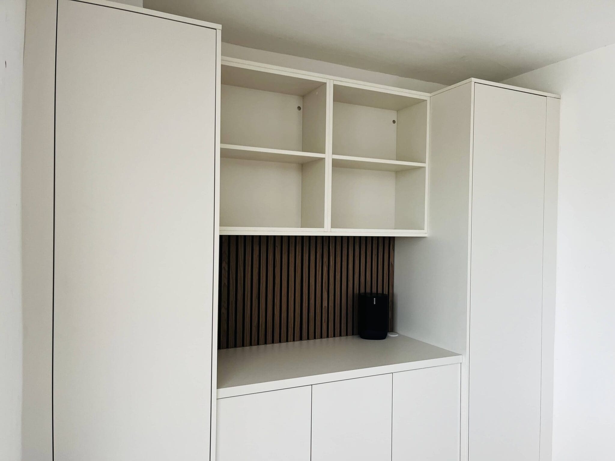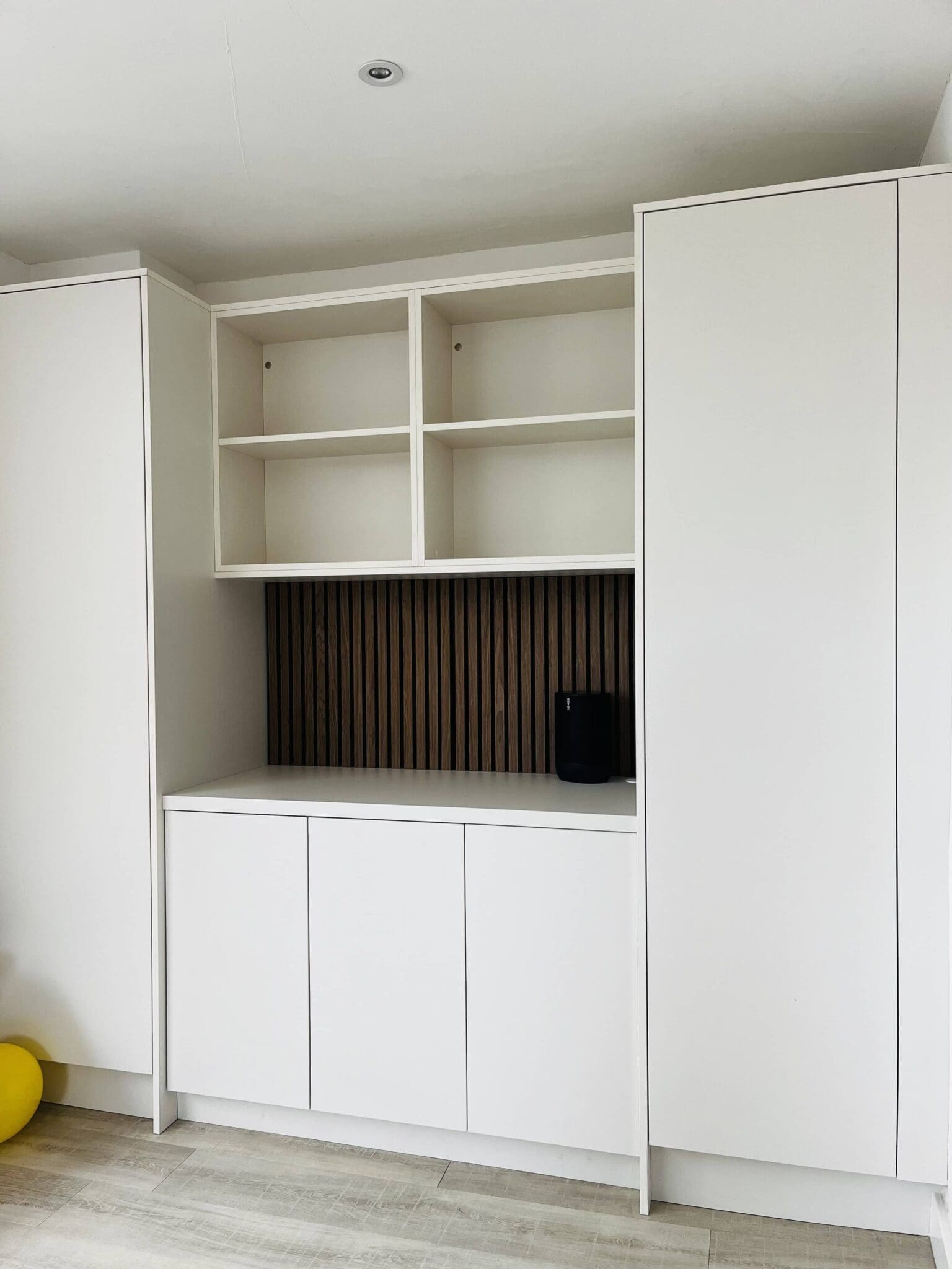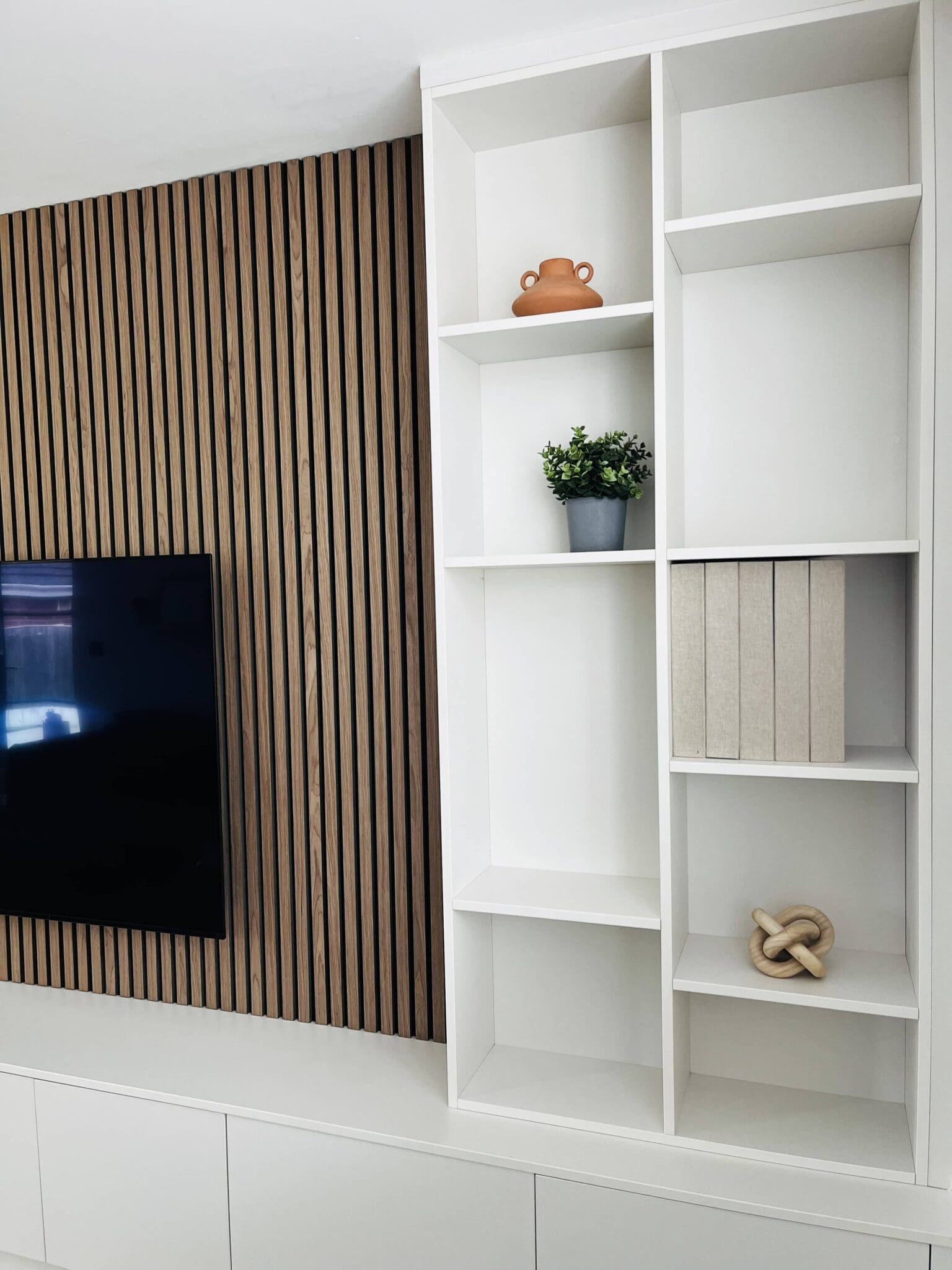 Additional storage to complement the existing kitchen and TV media wall was also installed. Bringing the warmth of the slat panels in Walnut to the central area provides a focal point to display those personalised items we love. This area has been transformed from an unused space to a practical, usable area.