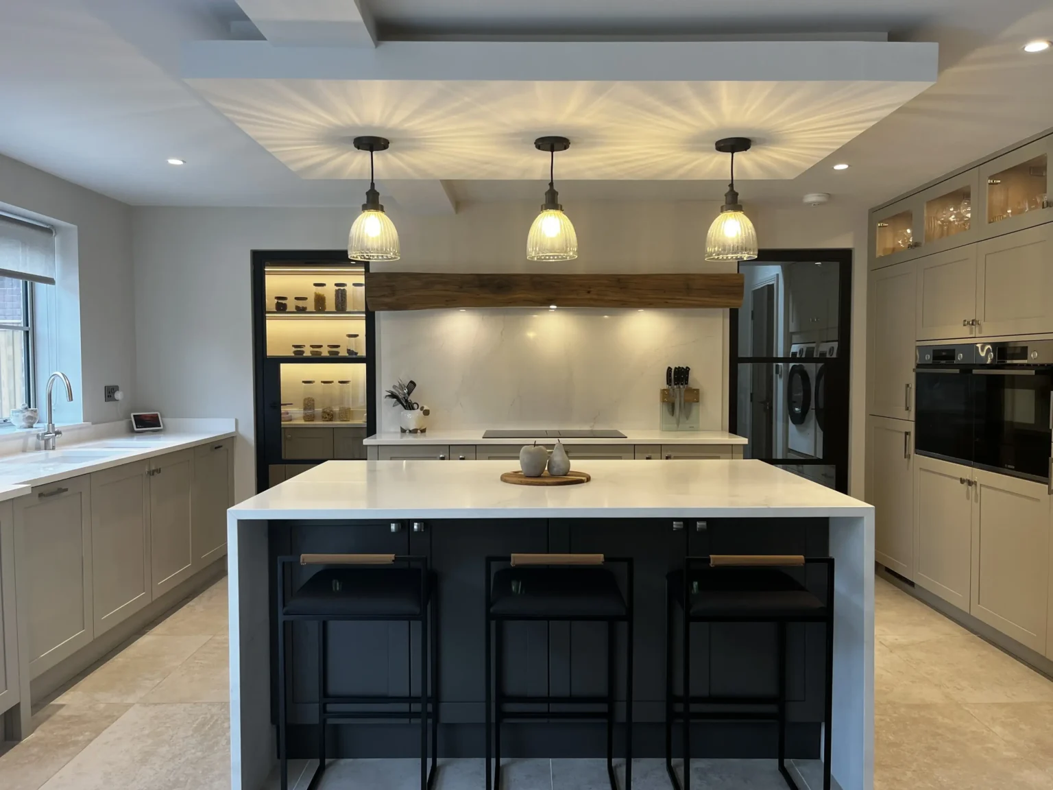 To create a timeless look they opted for Aldana by Stori, a narrow Ash shaker style door featuring a 5 piece solid frame with a flat veneer centre panel. The island in Lava gave a warmth of colour which beautifully complemented the Stone colour in the remainder of the kitchen. Coordinating Satin Nickel square knobs and D-handles added to the elegance of the room. Our design included quartz downstands on the island which the customer chose & installed themselves, creating a seamless flow of work surface.