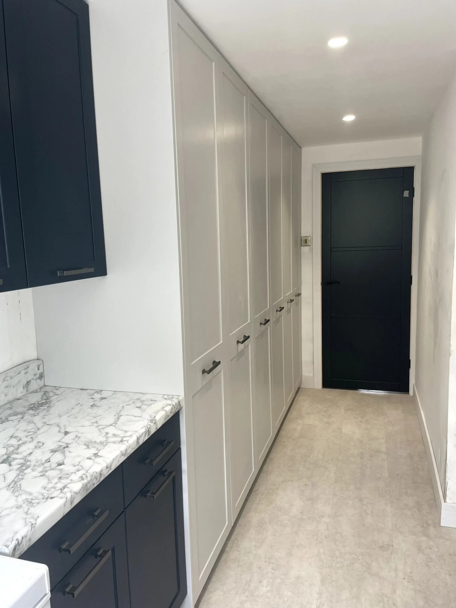 This family Pantry was part of a larger project including the kitchen and utility. Coordinated throughout, the customers chose the Shaker Melrose door by Ethos in Light Grey and Indigo, with shelves also in Indigo. Marble Calcutta laminate and square D handles in Black Nickel by Stori complete the look.