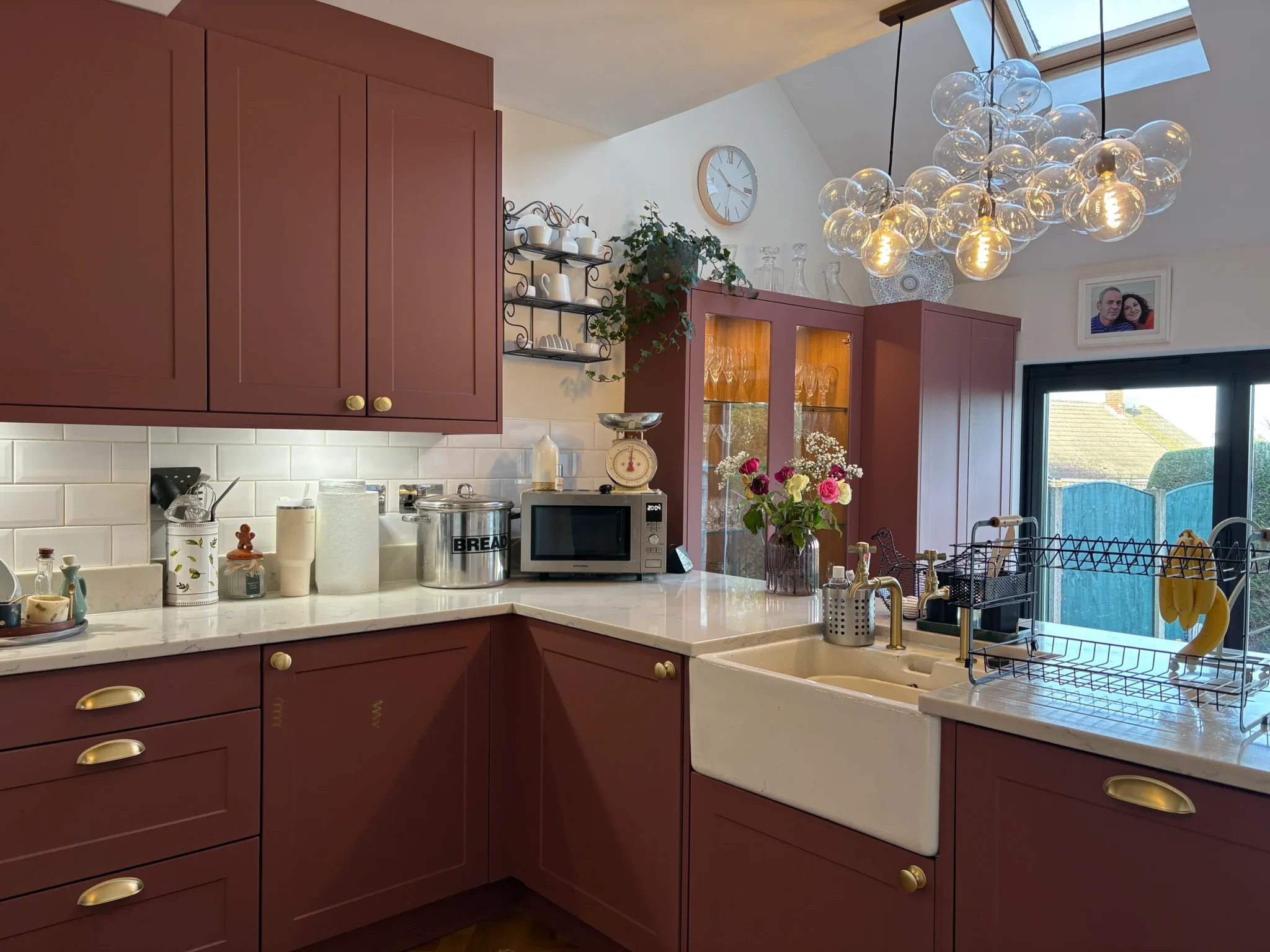 The room is flooded with natural light from the bifold doors and velux window. This showcases the colour of the cabinetry and the customer’s choice of bubble chandelier which is a stunning addition to the room, elevating the glamour!