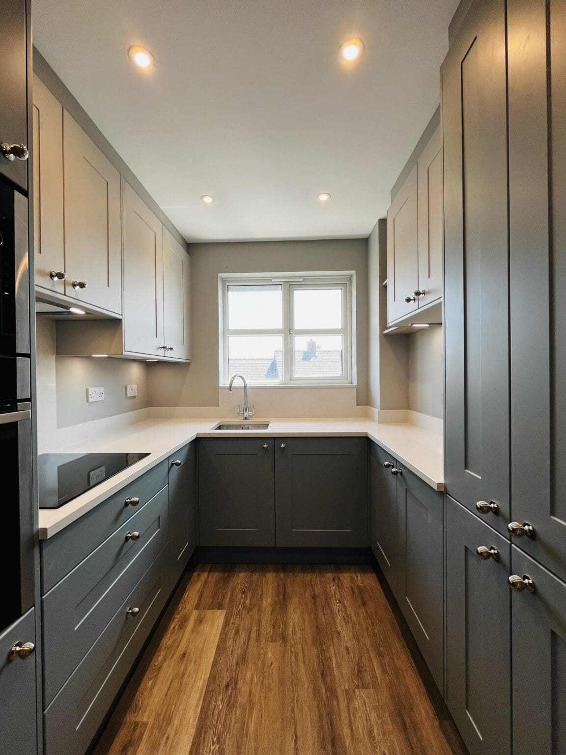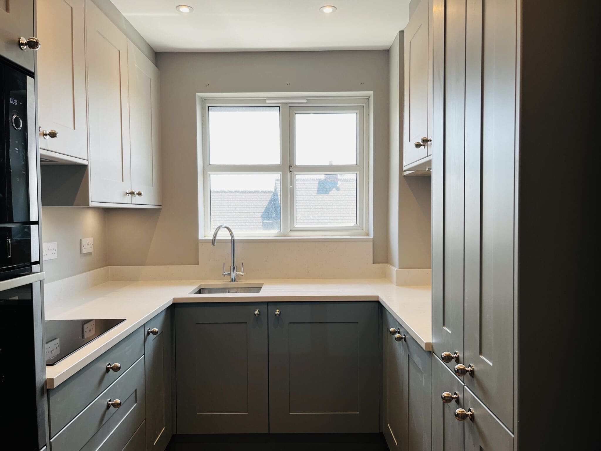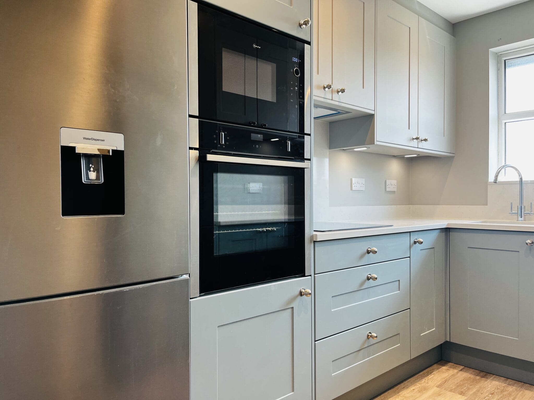 seamless, one piece vinyl-wrapped shaker design, this colour blend of Matt Fjord and Dove Grey oozes sophistication and calmness. Polished nickel knobs provide another layer of elegance. A Neff integrated microwave and slide & hide oven guarantees space saving in this compact kitchen.