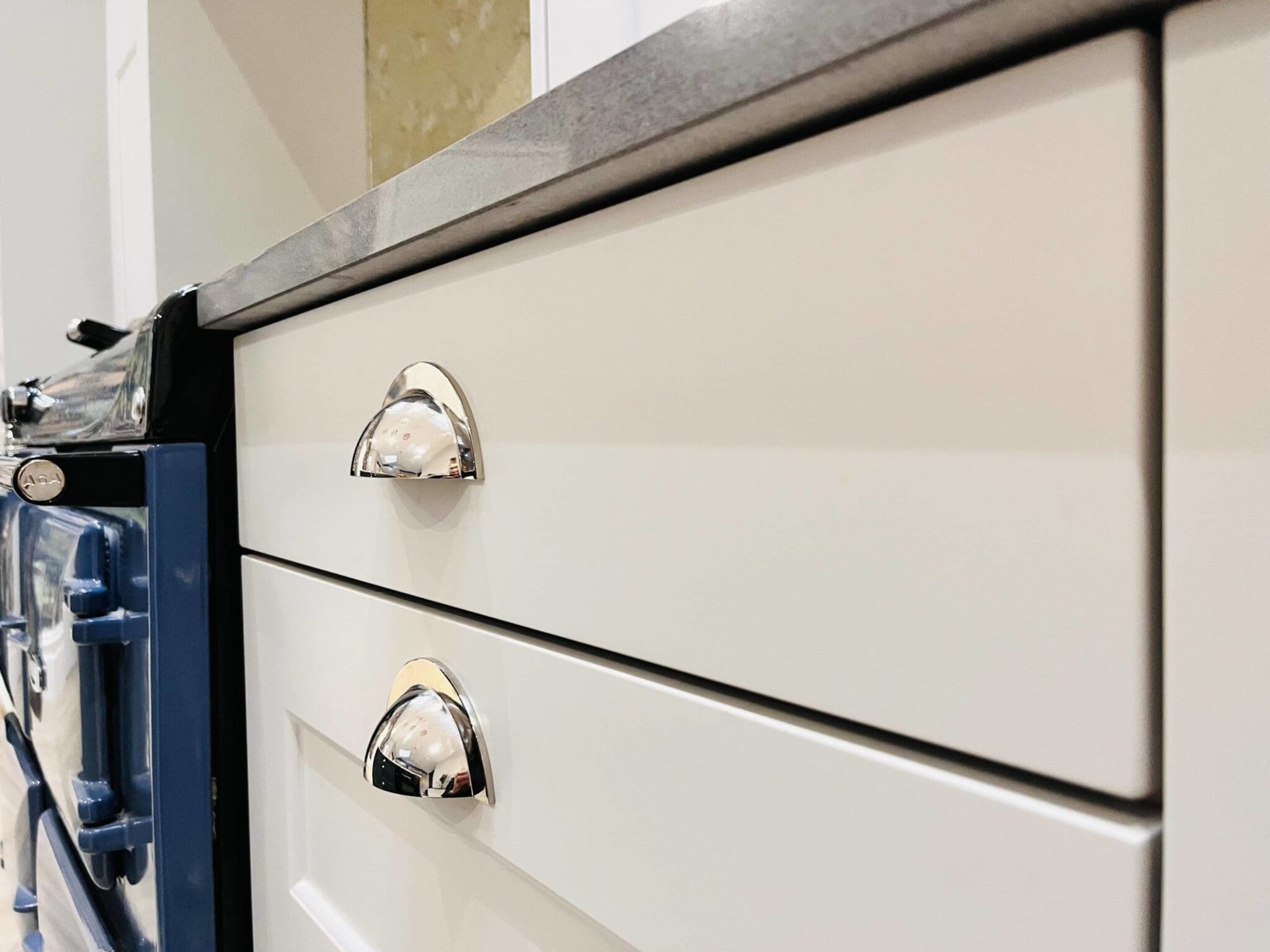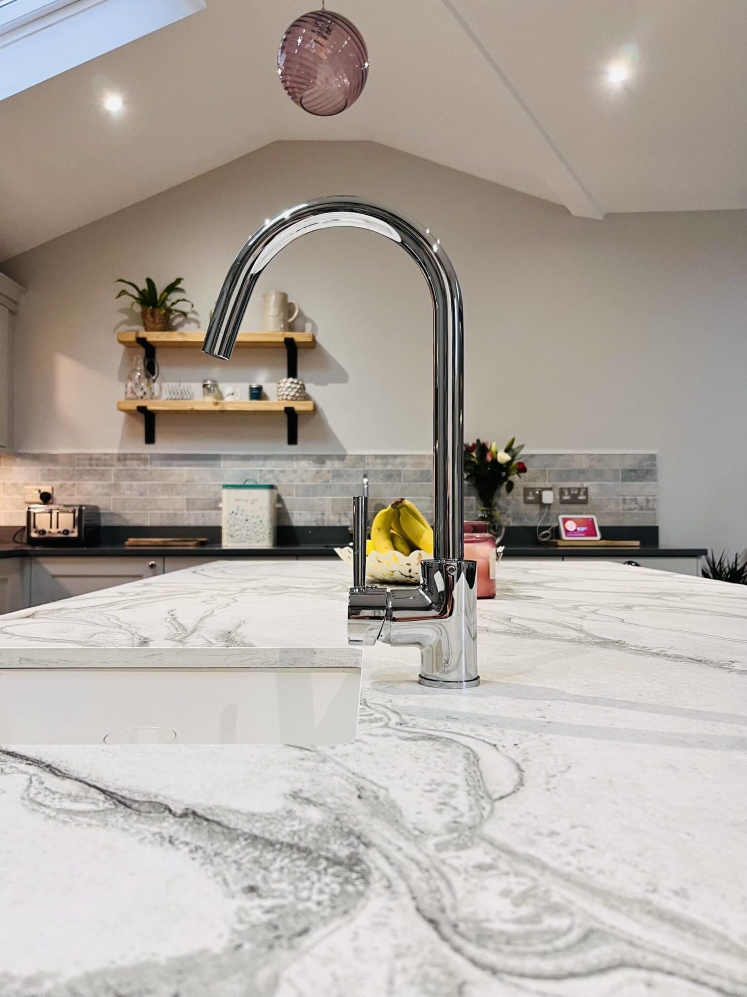 Choosing the right handles is a small but all important decision, and a mix of Stori polished chrome cup handles and knobs offers timeless elegance. The decision to have 2 working sinks was an easy decision for this busy family, with the main sink partnered with a Qettle boiling tap complete with filtered water. The rinsing sink in the island is accompanied with a single lever tap in polished chrome.