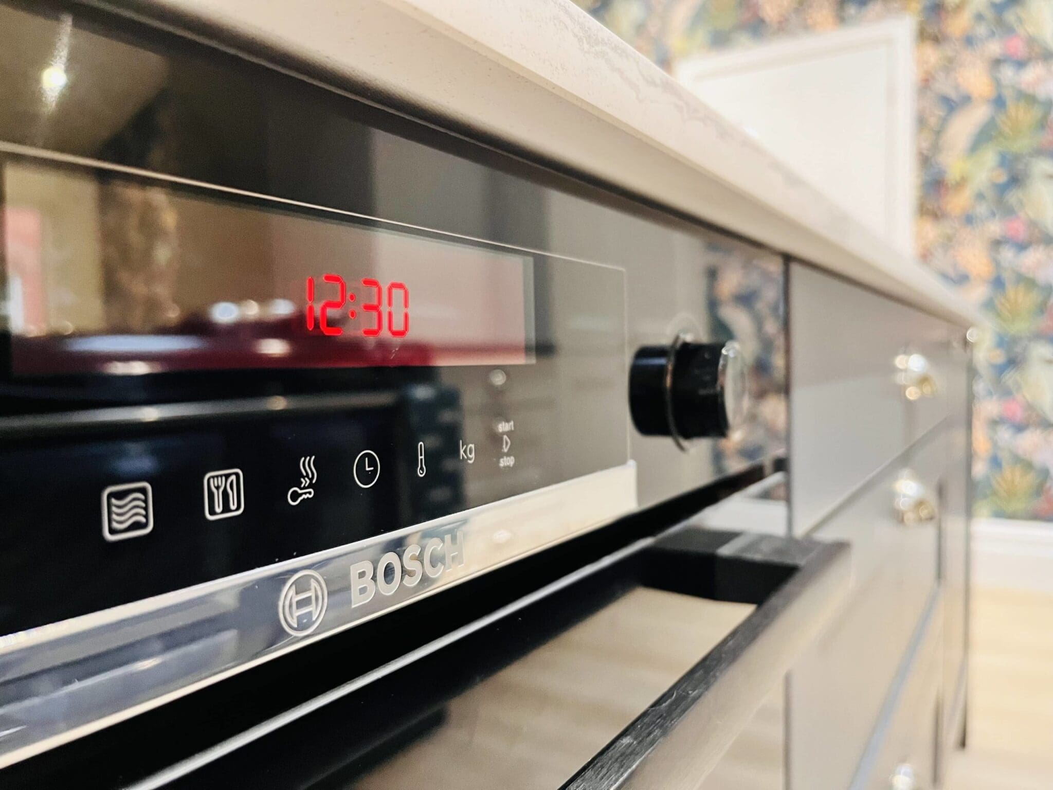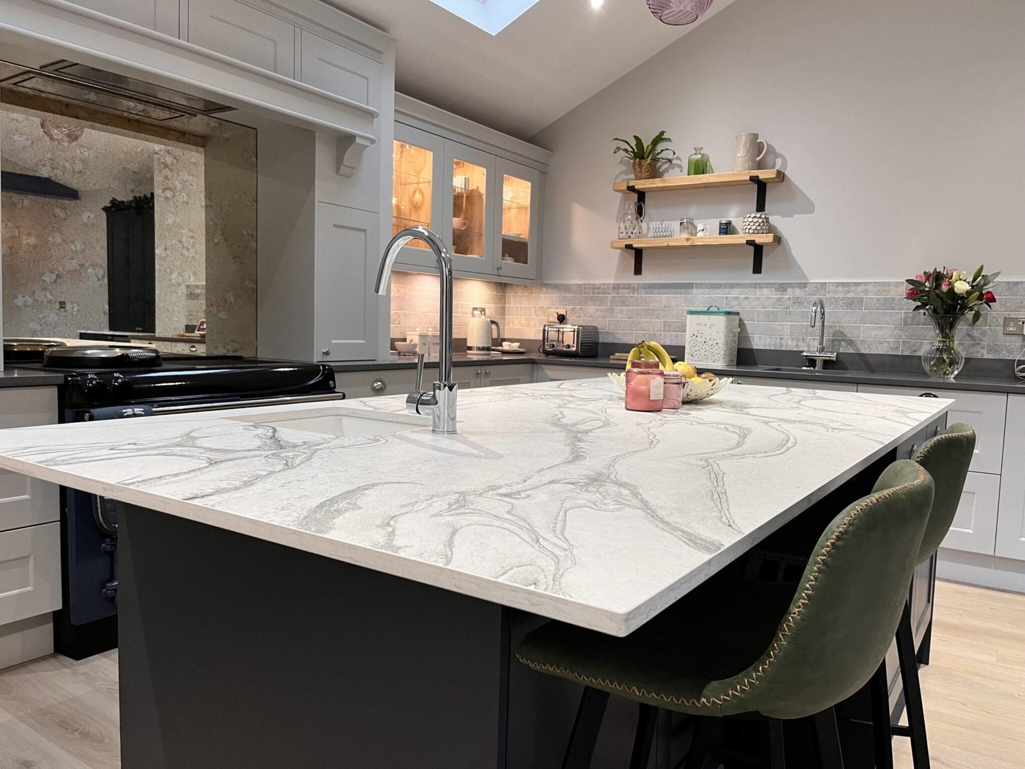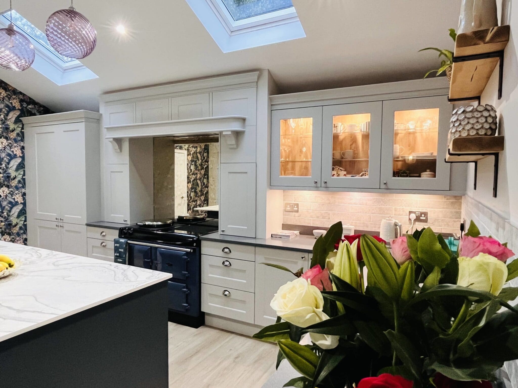 The beautiful working over mantle was a must have to compliment the wonderful AGA. The chunky yet elegant mantle shelf is suspended on solid timber painted corbels overlooking the working mantle cupboards. A Silvered Antique Mirror glass splashback behind the AGA ensures the drama of this kitchen continues. The glass fronted wall cupboards are complemented with internal LED lighting and Sensio Solo under cabinet lights. With over 30 wood colours, deciding on a colour for the internals of the glass cabinets was a task in itself, but several changes later, the final answer was Natural Bardolino Oak.