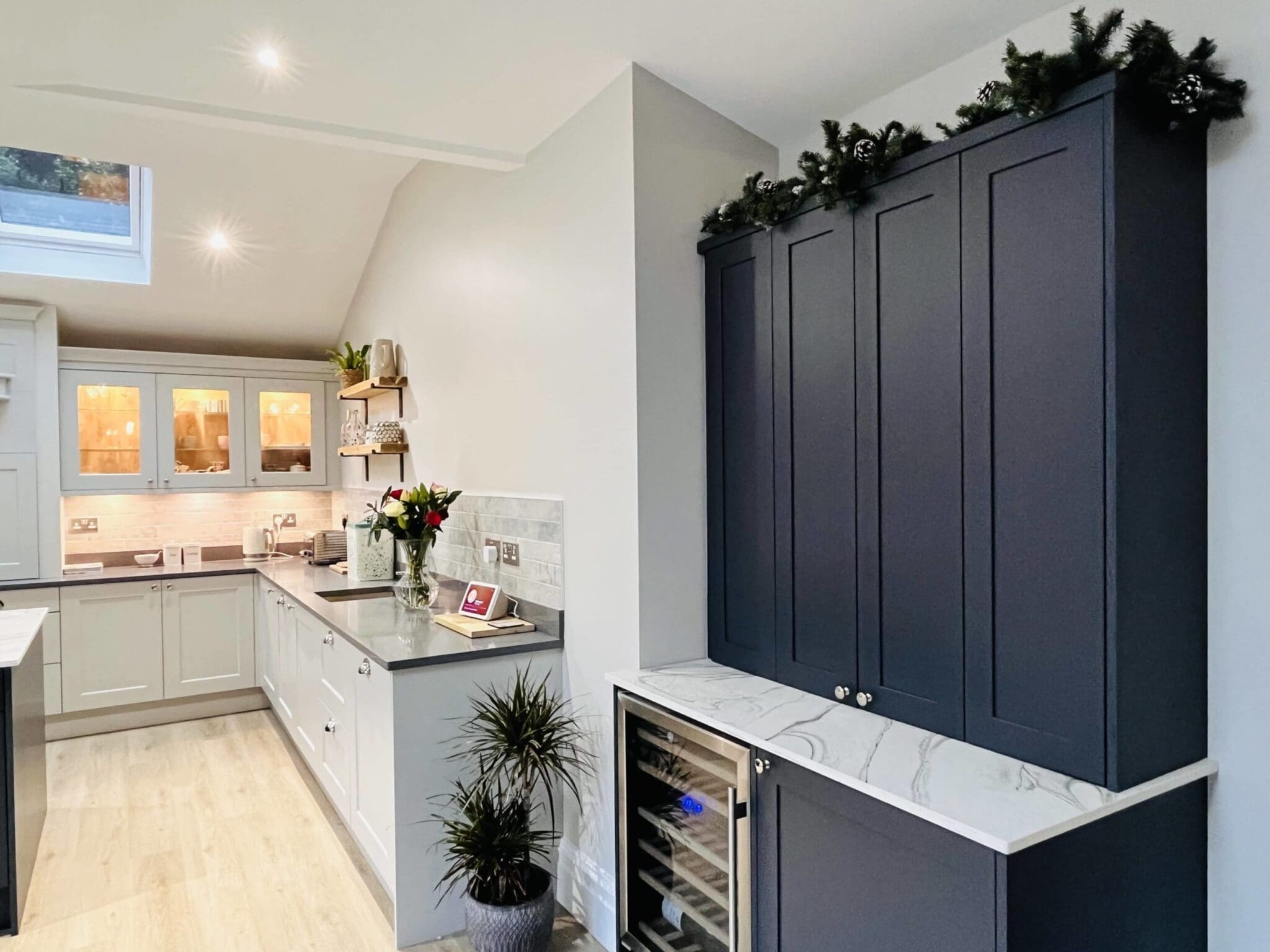 When a room is flooded with natural light it gives you the opportunity to be as bold and dramatic as you dare. The classic style of Florence by Stori in painted light grey against the stunning simplicity of the Aldana shaker-style door, also by Stori, in painted slate blue, accentuated by its narrow frame for a decidedly modern look certainly breaks all boundaries on staying safe. With these ideas in mind, we thought why not go one step further and create a kitchen with not just two work surface colours, but two colours and two different products. The main working surface is a Natural Stone Quartz in Grey Glitter, with the island in Dekton in the stunning colour of Liquid Sky.