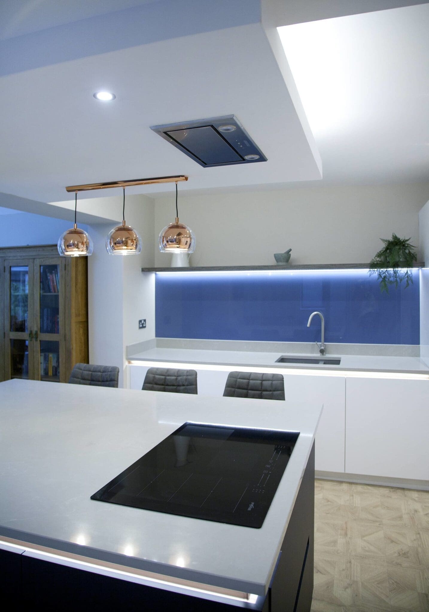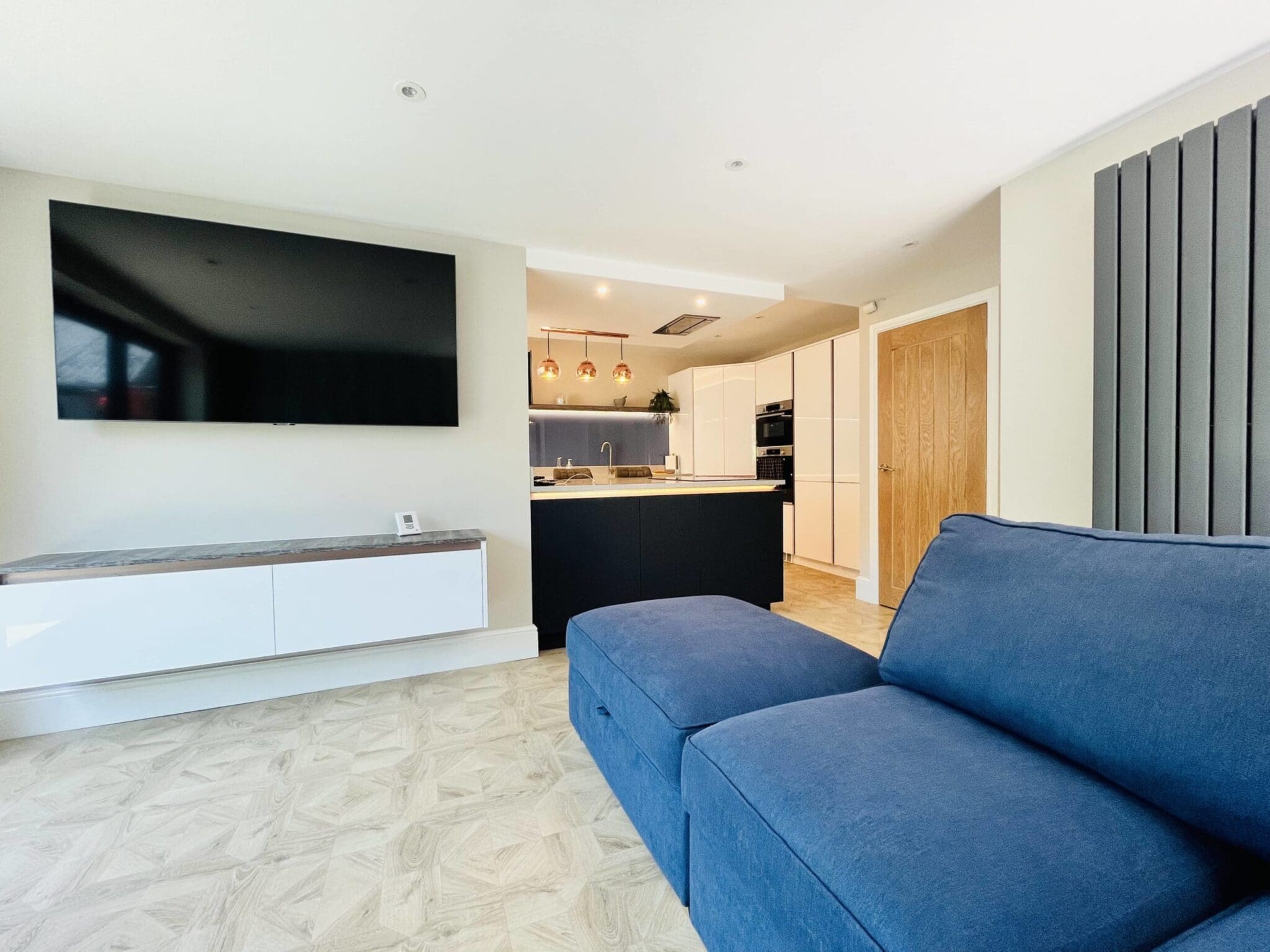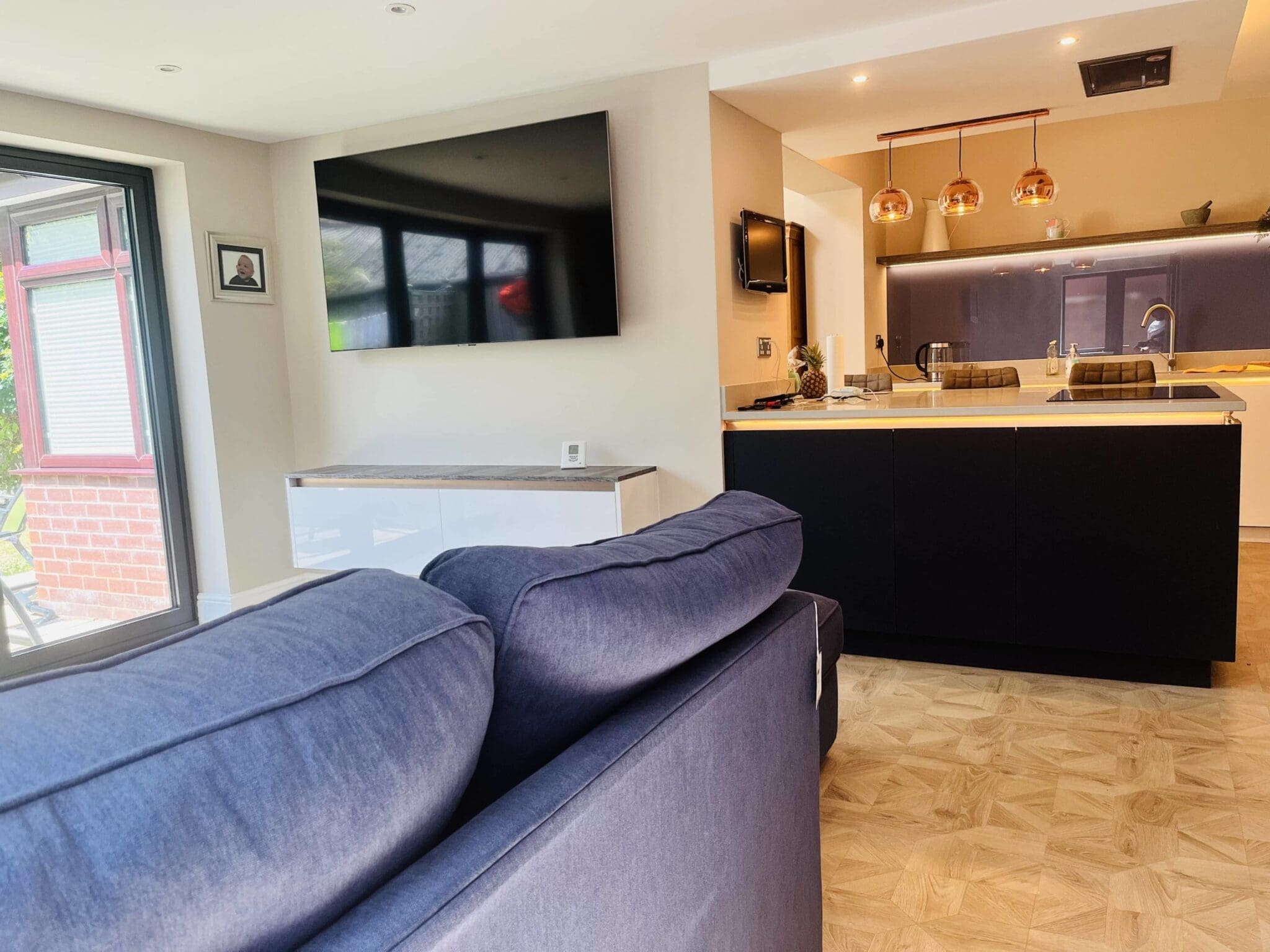 Not only did this family want to make their existing kitchen and dining room into one big family space, they also wanted to relocate the kitchen to the other side of the room, remove a window and install bifold doors providing direct access into the garden. Building, electrical, plumbing & plastering work were all completed by us. We also built a bespoke matching floating unit with a ‘Pasedena Pine’ top to house the media boxes and keep this area clutter free.