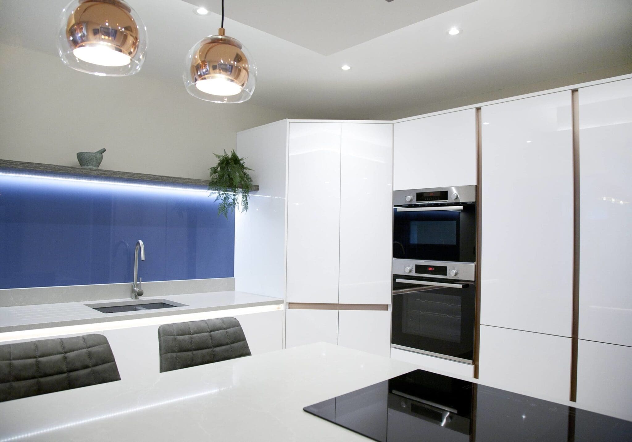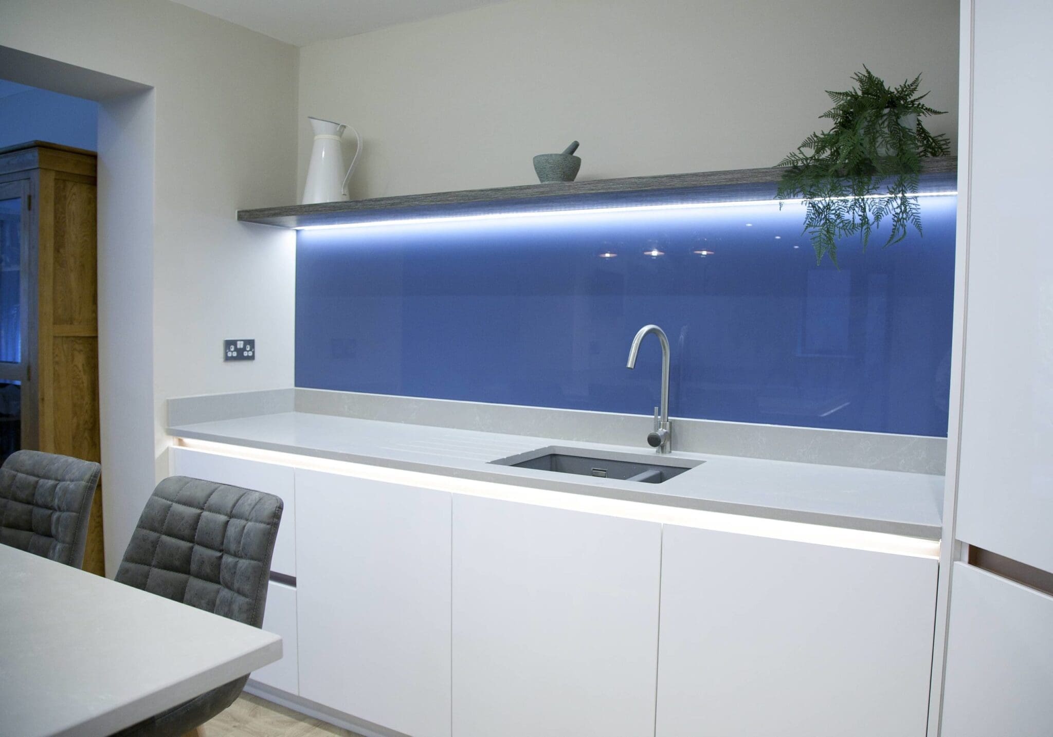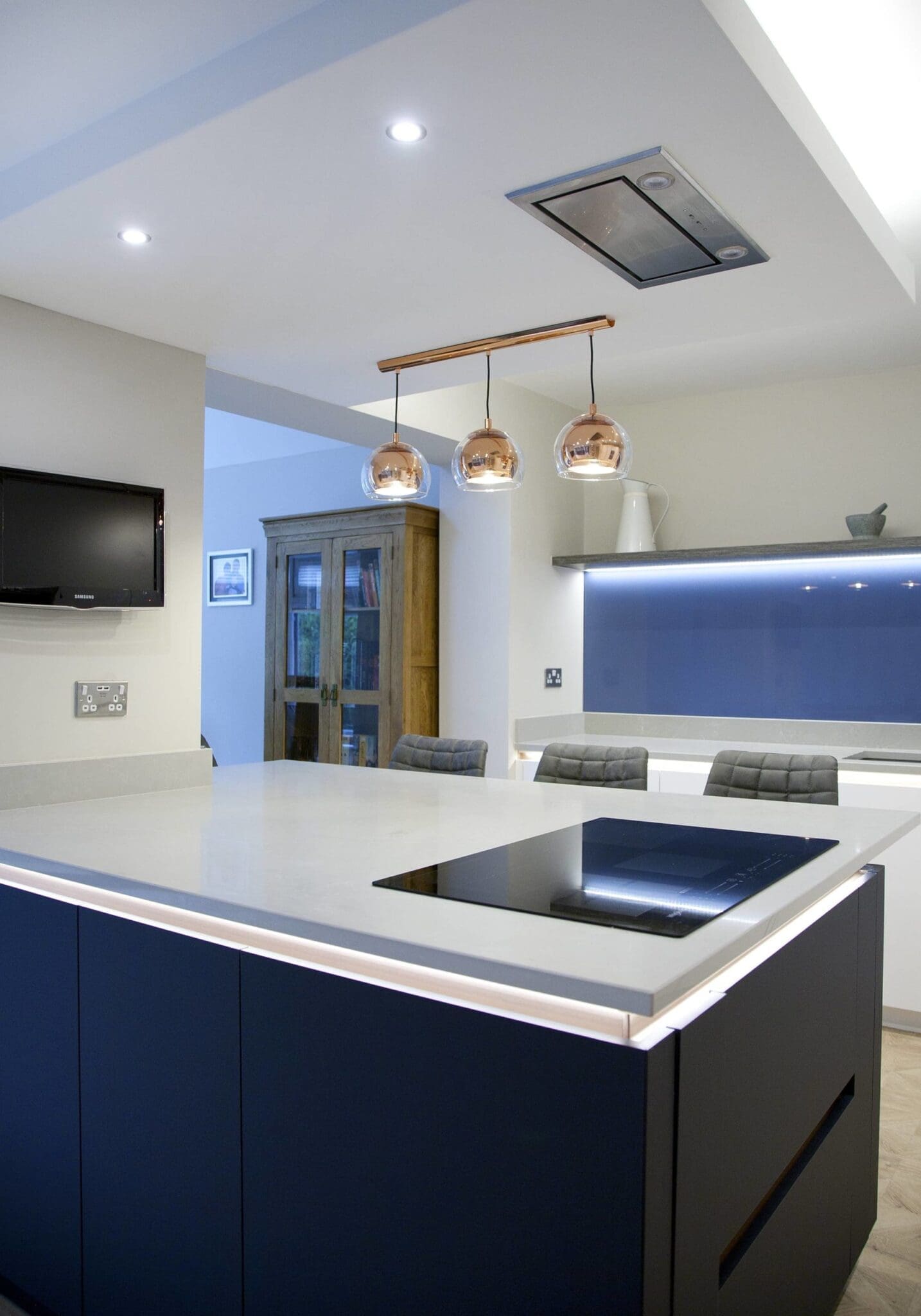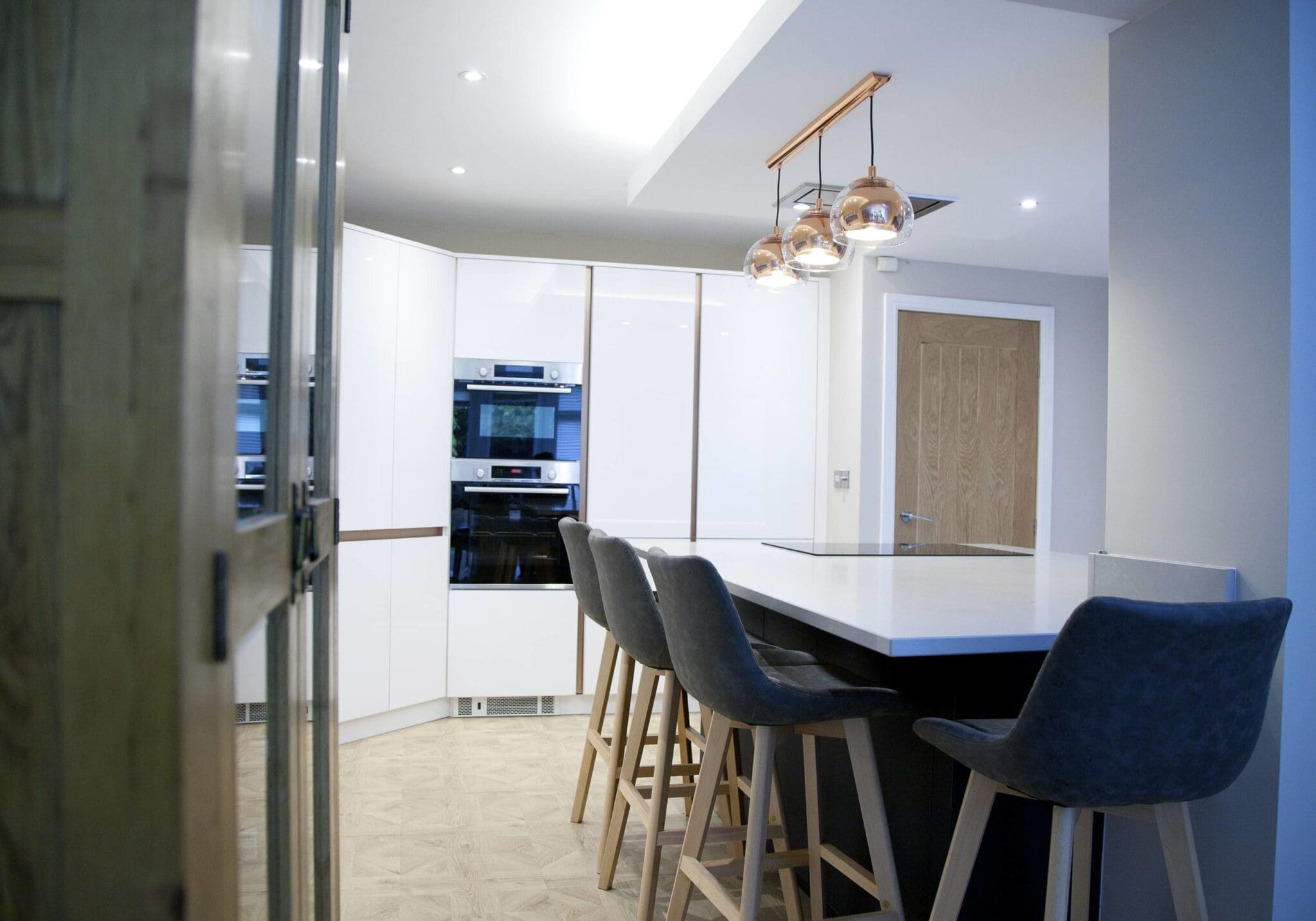 Not only did this family want to make their existing kitchen and dining room into one big family space, they also wanted to relocate the kitchen to the other side of the room, remove a window and install bifold doors providing direct access into the garden. Building, electrical, plumbing & plastering work were all completed by us. We also built a bespoke matching floating unit with a ‘Pasedena Pine’ top to house the media boxes and keep this area clutter free.
