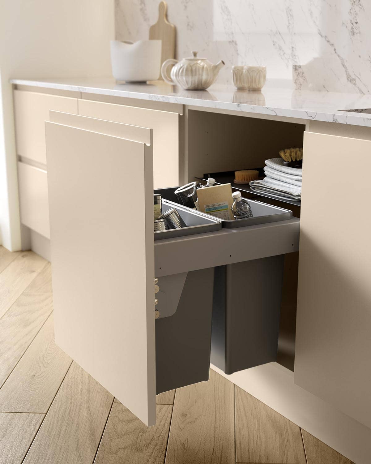 A pull-out bin featuring two compartments is perfect for separating everyday waste and recyclables.