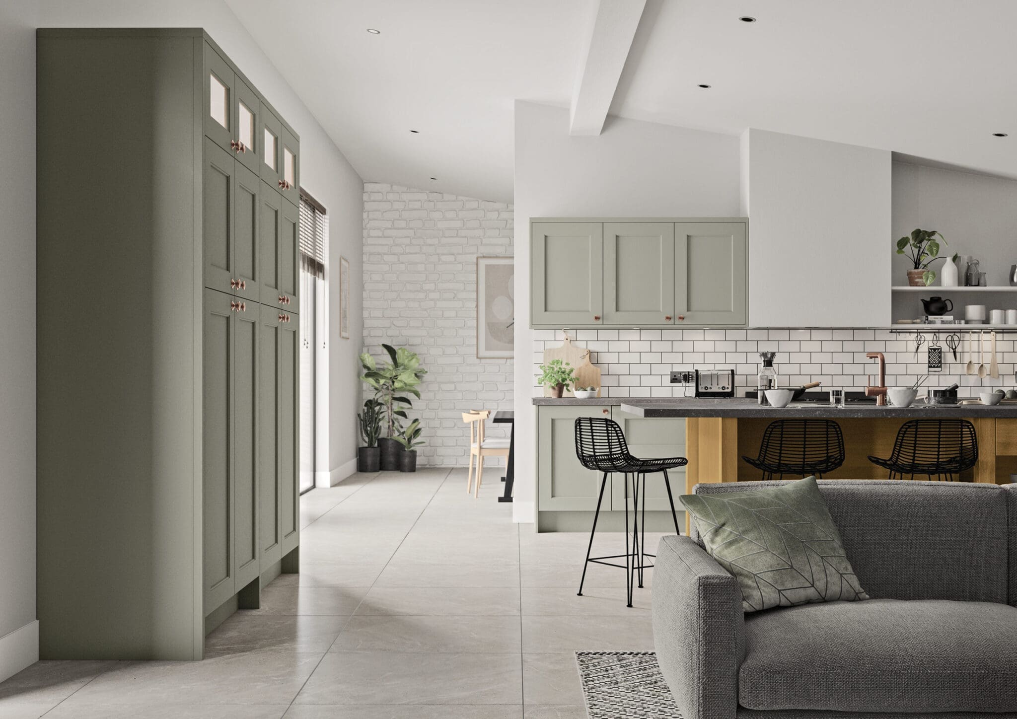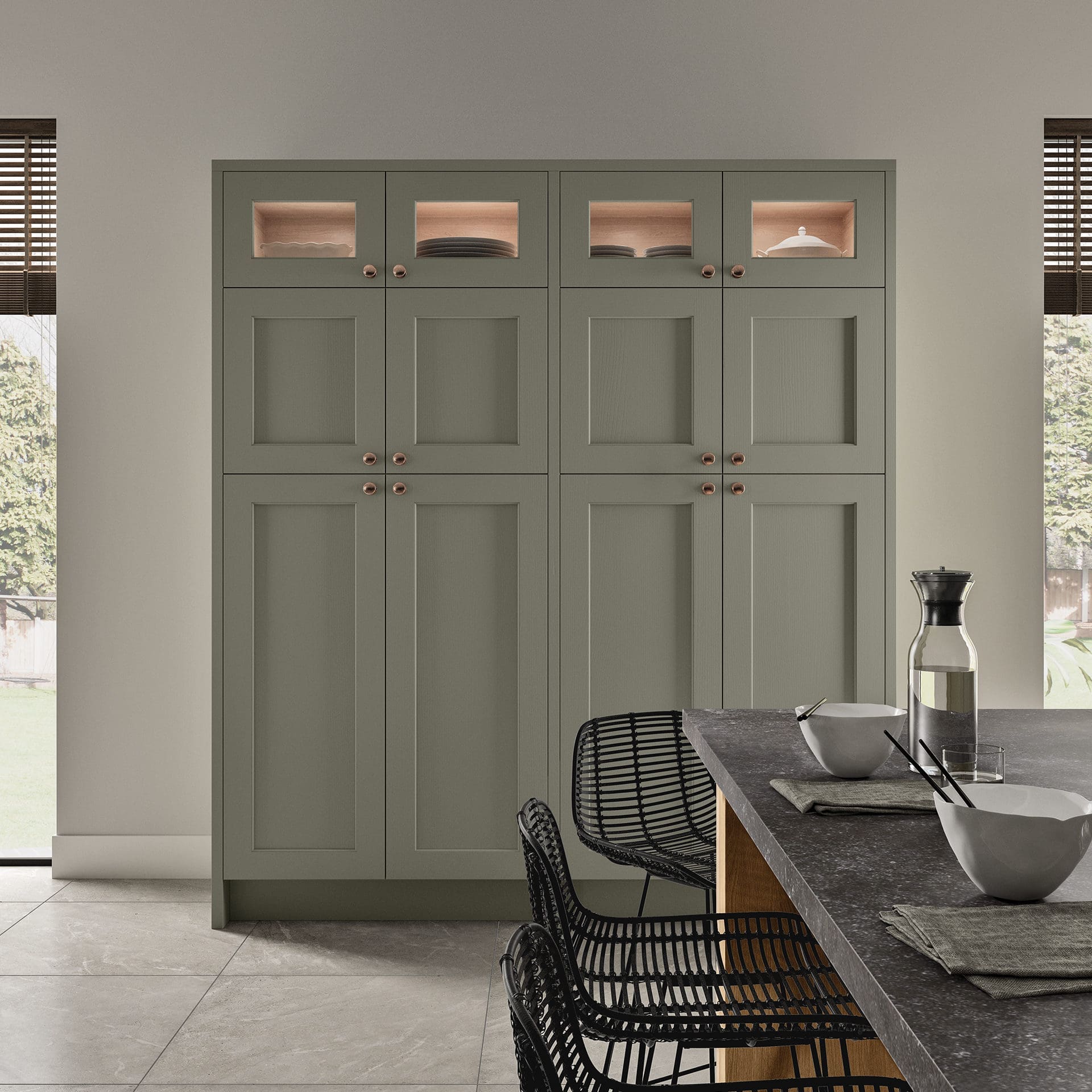 This design features tall larder units with glazed top boxes in Cardamom. The island is given prominence in Light Oak with its chunky modular pilasters and feature plinth details on the end panels. Worktop is Fossil Dekton. Dekton’s great resistance to impact and scratches makes it perfect for everyday use in the kitchen. Dekton boasts very low porosity, making it extremely resistant to water and stains, and withstands abrasion better than granite and porcelain.
