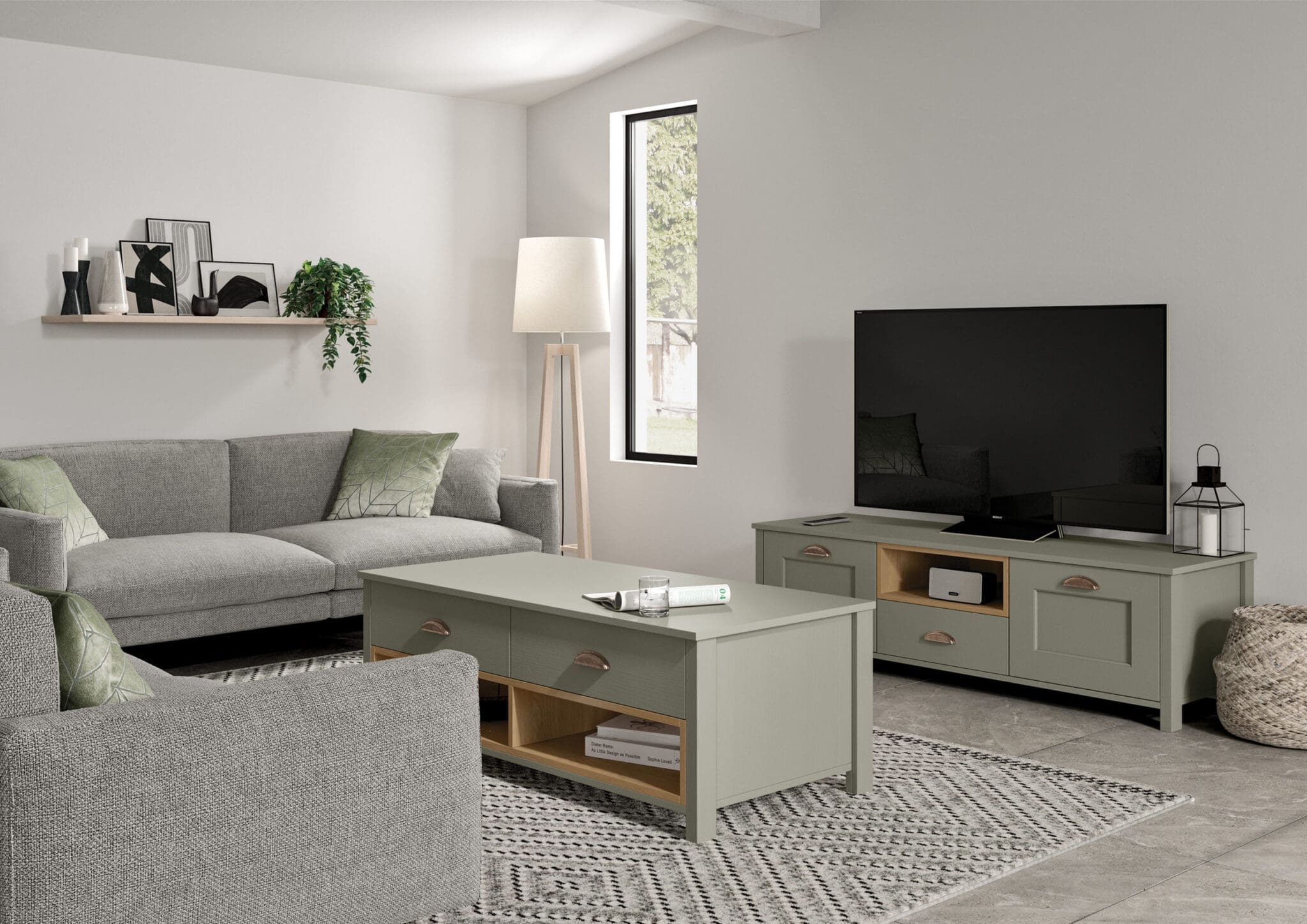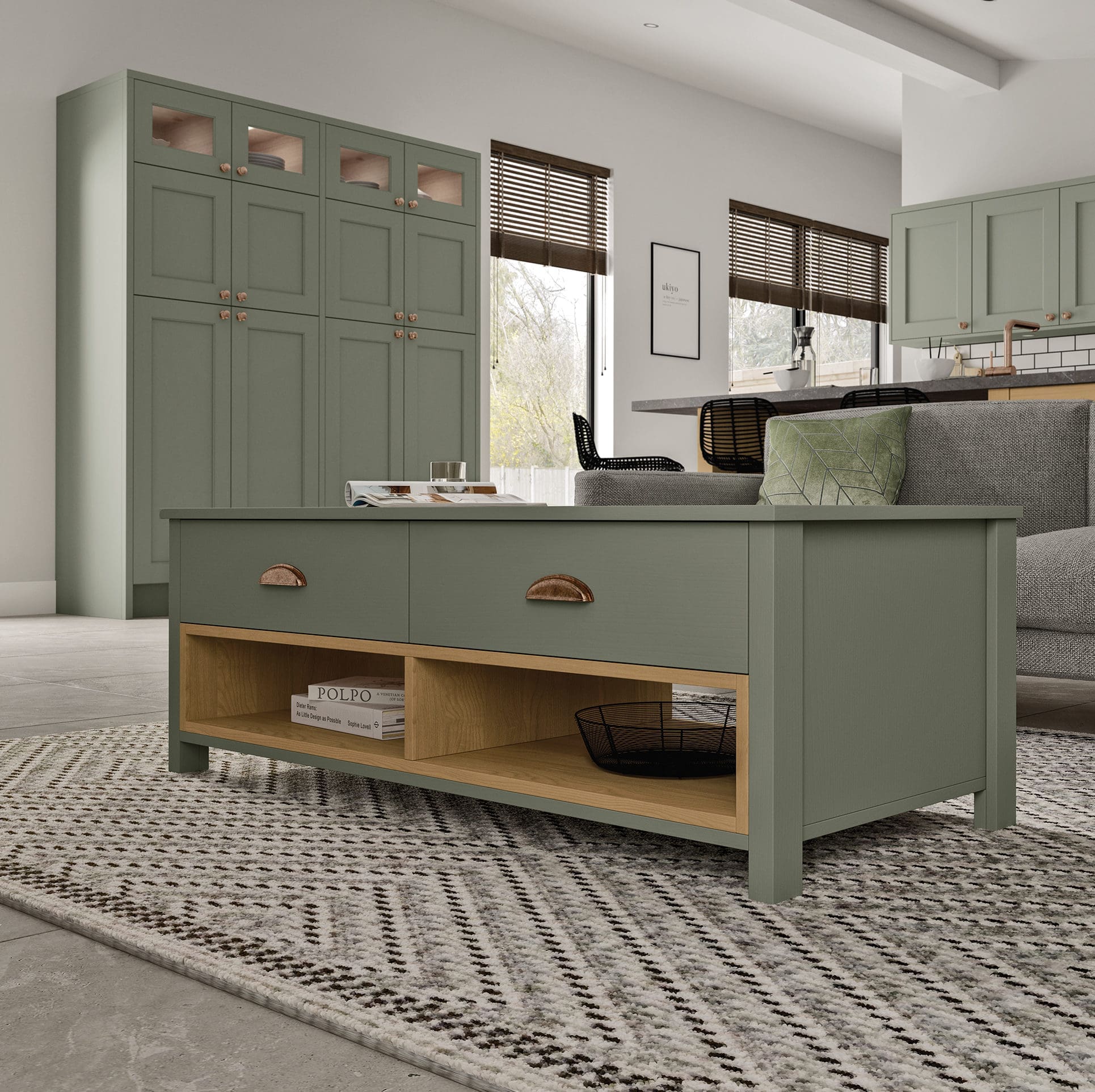 The open plan living space complements the kitchen with a coffee table and wide media unit in Cardamom with contrasting Light Oak open shelves.