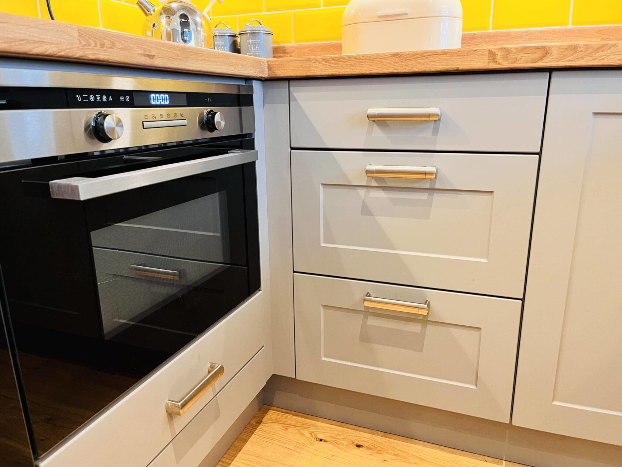 What a bold statement these yellow brick tiles make! Bright and beautiful, these yellow tiles complement the Dust Grey doors beautifully.
