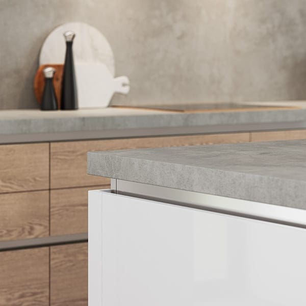Our Zola White Gloss and Tavola oak kitchen design is part of the Sleek Serenity kitchen collection and includes crisp white cabinets and a cool concrete worktop offset beautifully by the warmth of natural timber. The handleless aluminium rail system dispenses the need for handles.